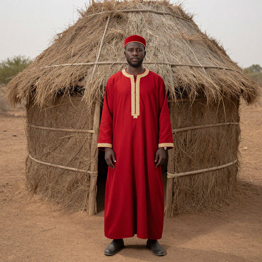 "Zulu Attire Married Costume, man in a red robe standing in front of a hut"
