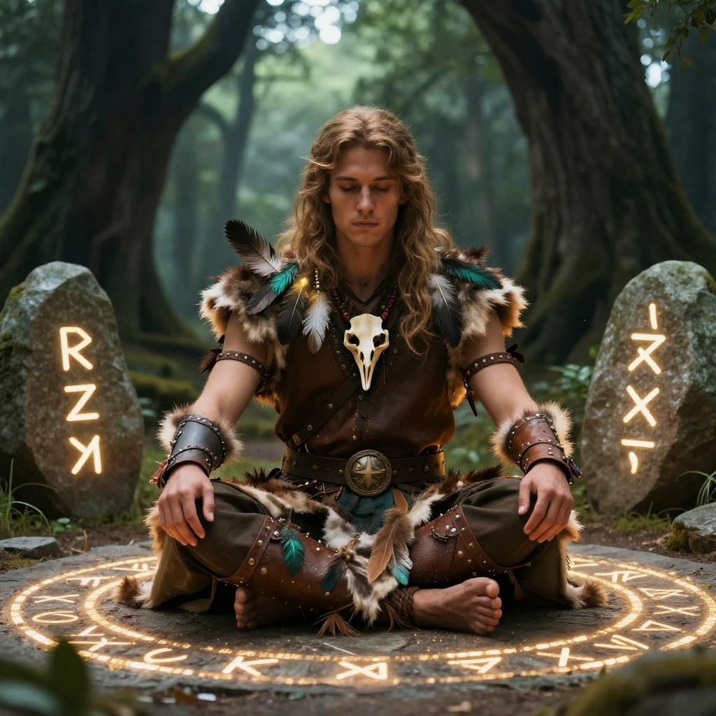 Digital artwork of a long-haired, blonde, young man in fur and leather tribal attire, meditating on a glowing, rune-etched forest floor.