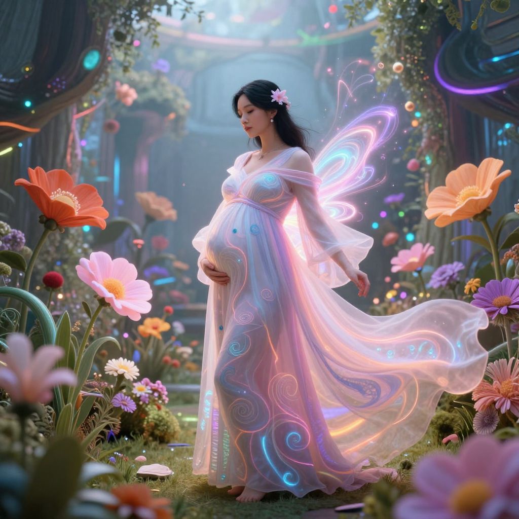 Hyperpregnant woman standing in a surreal futuristic garden, glowing ethereal light surrounding her, vibrant flowers blooming wildly, intricate patterns on her flowing dress, soft pastel colors blending with neon accents, capturing a magical, otherworldly atmosphere.