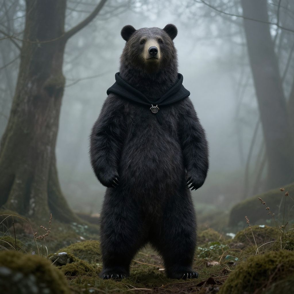 Photograph of a standing, anthropomorphic bear with dark brown fur, wearing a black scarf, in a foggy forest with moss-covered ground and tall