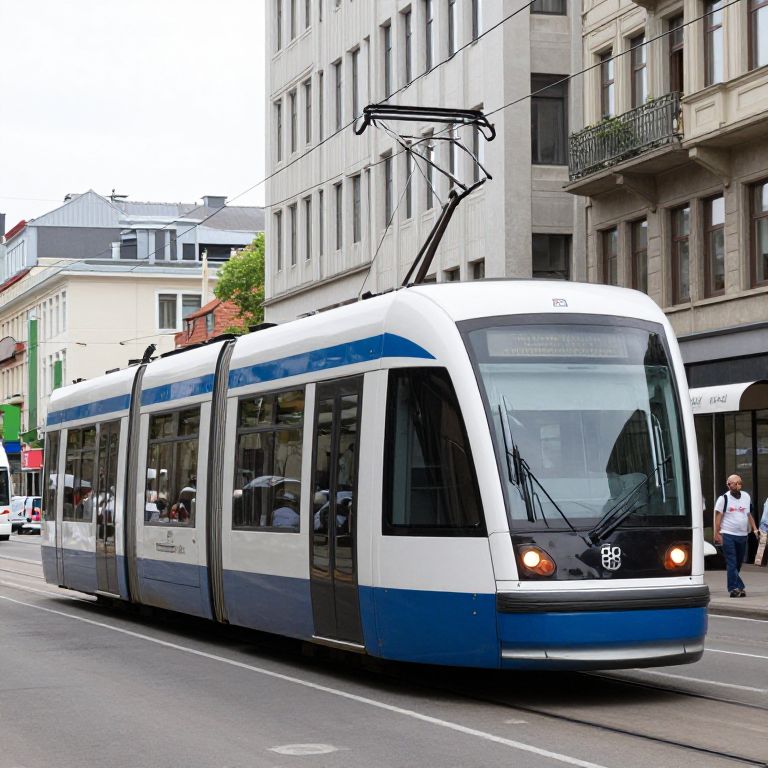 Photograph of a white and blue modern tram with a sleek, angular design on a city street. The tram, labeled with number 89, has large windows and is traveling on tracks embedded in the road. It is flanked by tall, gray buildings with numerous windows and balconies. Pedestrians, including a person in a white shirt, are visible on the right sidewalk. The background includes a green building and a red-roofed structure. The sky is overcast, and the street is lined with vehicles. The overall scene captures an urban, European cityscape.