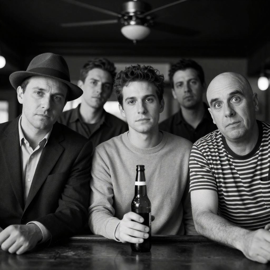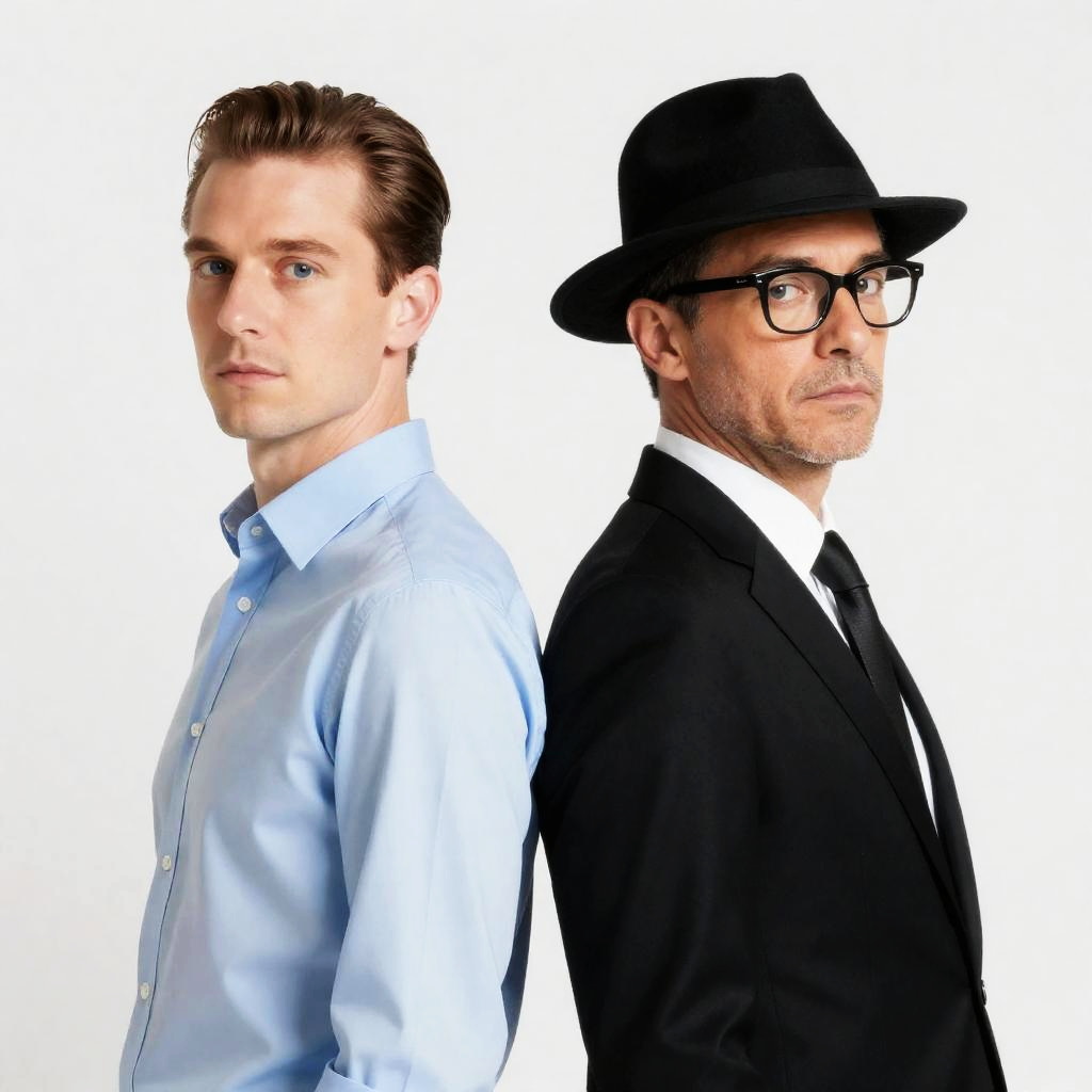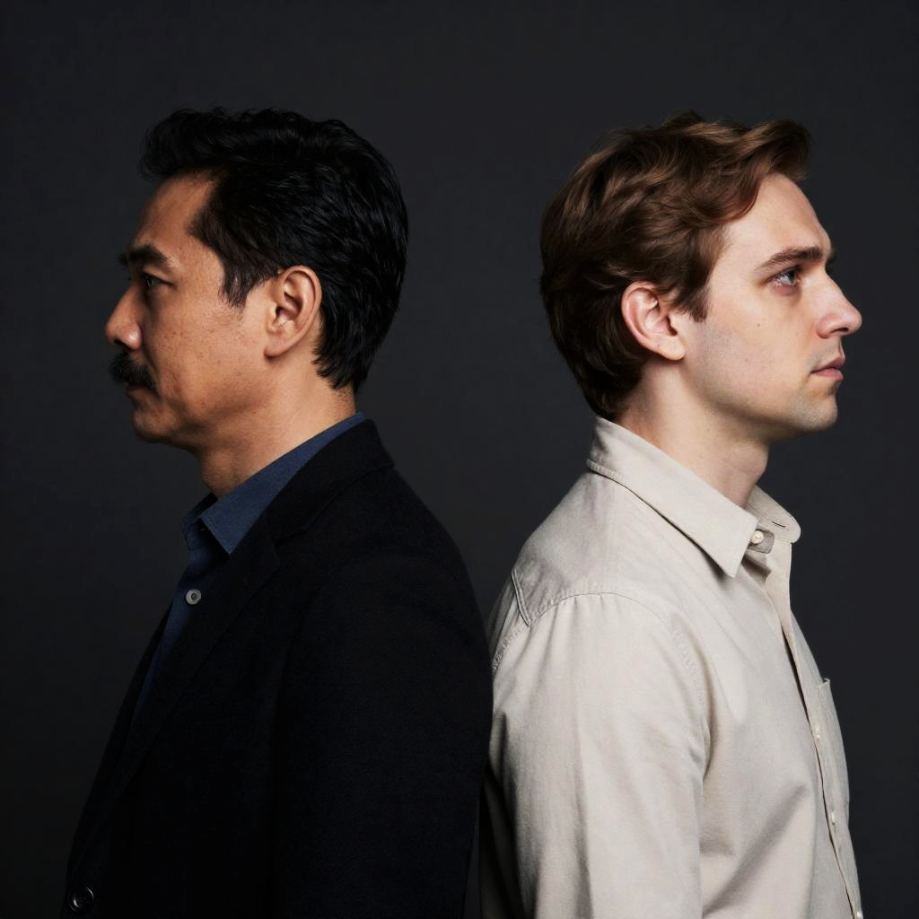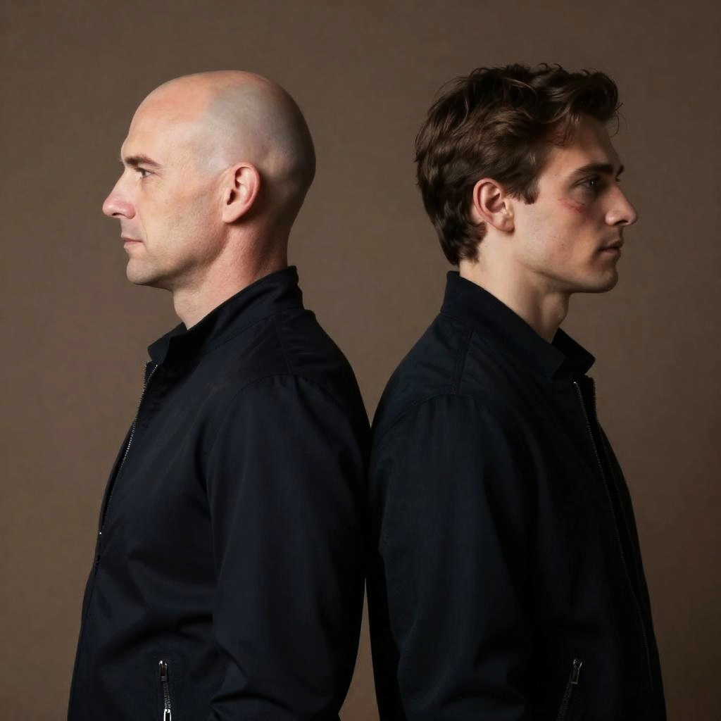 Photograph of two men back-to-back. Bald man with neutral expression, wearing a dark jacket. Brown-haired man with slight scar on cheek, focused expression, also in dark jacket. Brown background, soft lighting. Both in profile view.