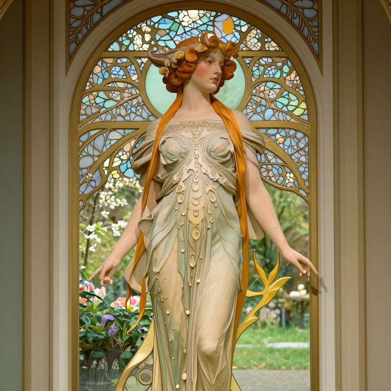 This photograph captures a striking Art Nouveau-style statue of a fair-skinned woman with wavy, red-orange hair and intricate, golden horn-like accessories. She wears a flowing, golden gown adorned with circular patterns and delicate, wing-like extensions. Her serene expression is framed by a semi-circular, stained-glass window behind her, featuring a mix of blue, green, and yellow hues. To her left, a bouquet of colorful flowers adds a natural touch. The background reveals a blurred, sunlit garden with greenery and flowers, enhancing the statue's ethereal beauty. The statue stands in an arched, ornate frame, emphasizing its elegant and artistic design.