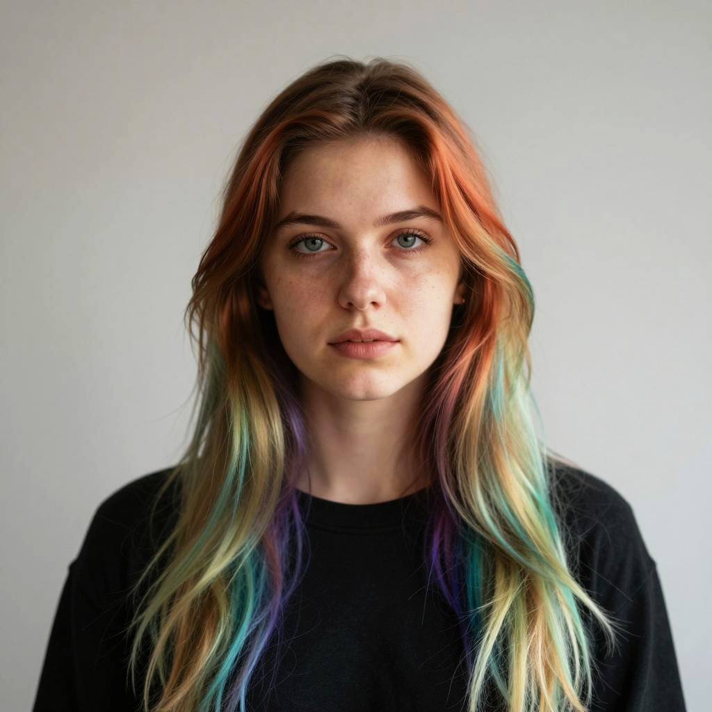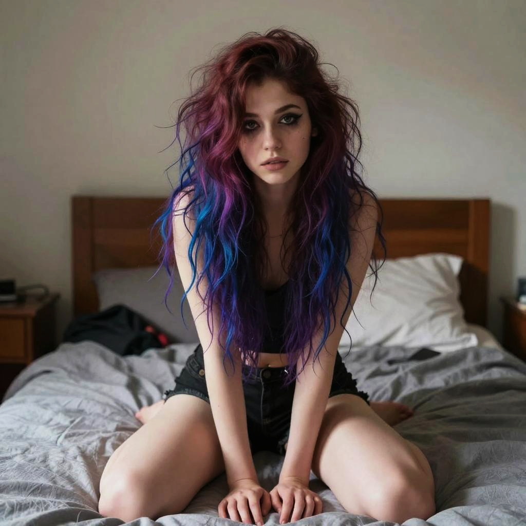 Realistic, beautiful girl in messy bedroom, full body, poofy hair, (realistic face, perfect eyes, perfect face:1.1), colourful hair, emo makeup, eyeliner