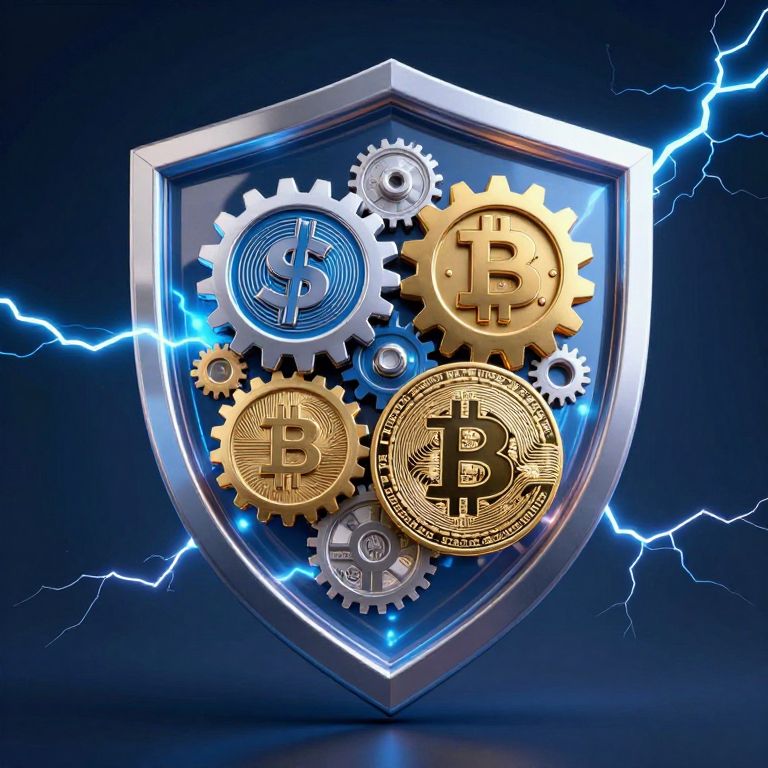Digital illustration of a silver shield with gold and blue Bitcoin gear icons, surrounded by blue lightning bolts on a dark background. Symbolizing cryptocurrency security and power