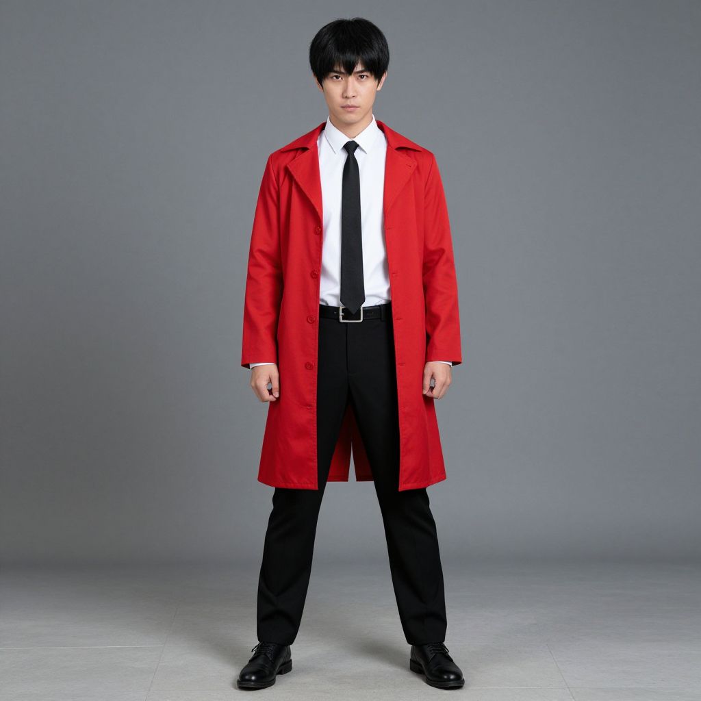 Photograph of a young man with pale skin and black, slightly messy hair, standing against a plain gray background. He wears a bright red, knee-length trench coat over a white dress shirt, black tie, and black pants. His black leather shoes have a slight shine. His expression is neutral, with a slight frown. The image is well-lit, with the focus on the subject, who is centered in the frame. The gray background is smooth and untextured, highlighting his outfit. The overall style is simple and modern.