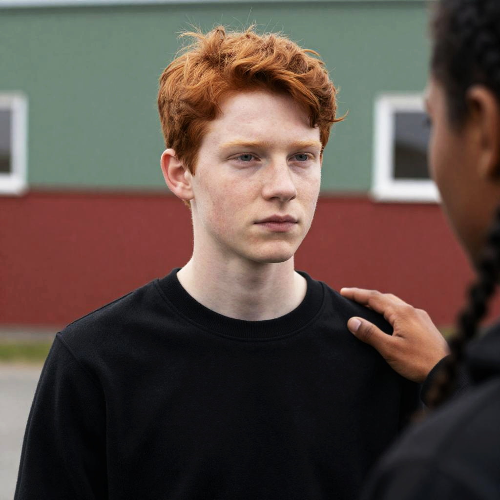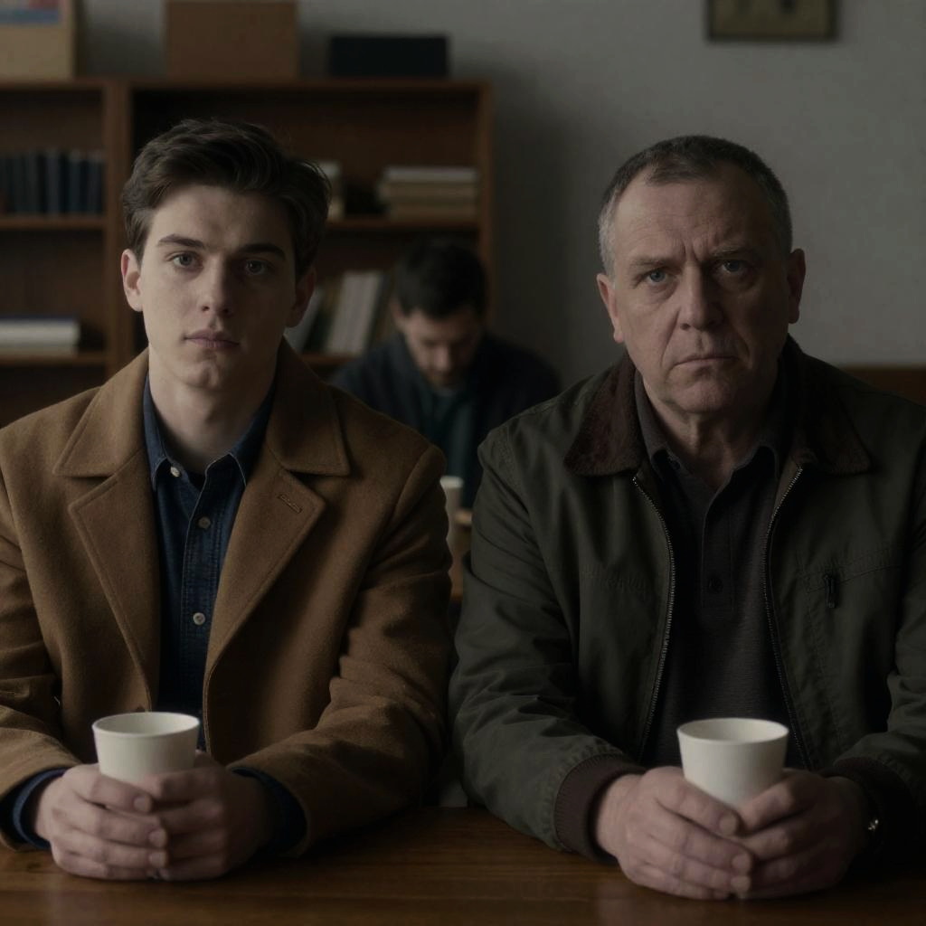 Man with short red hair, wearing brown jacket, sits alone in dimly lit diner booth. He looks down, holding cup, beside ketchup bottle, sugar dispenser, and small plate. Two posters on gray wall behind him.
