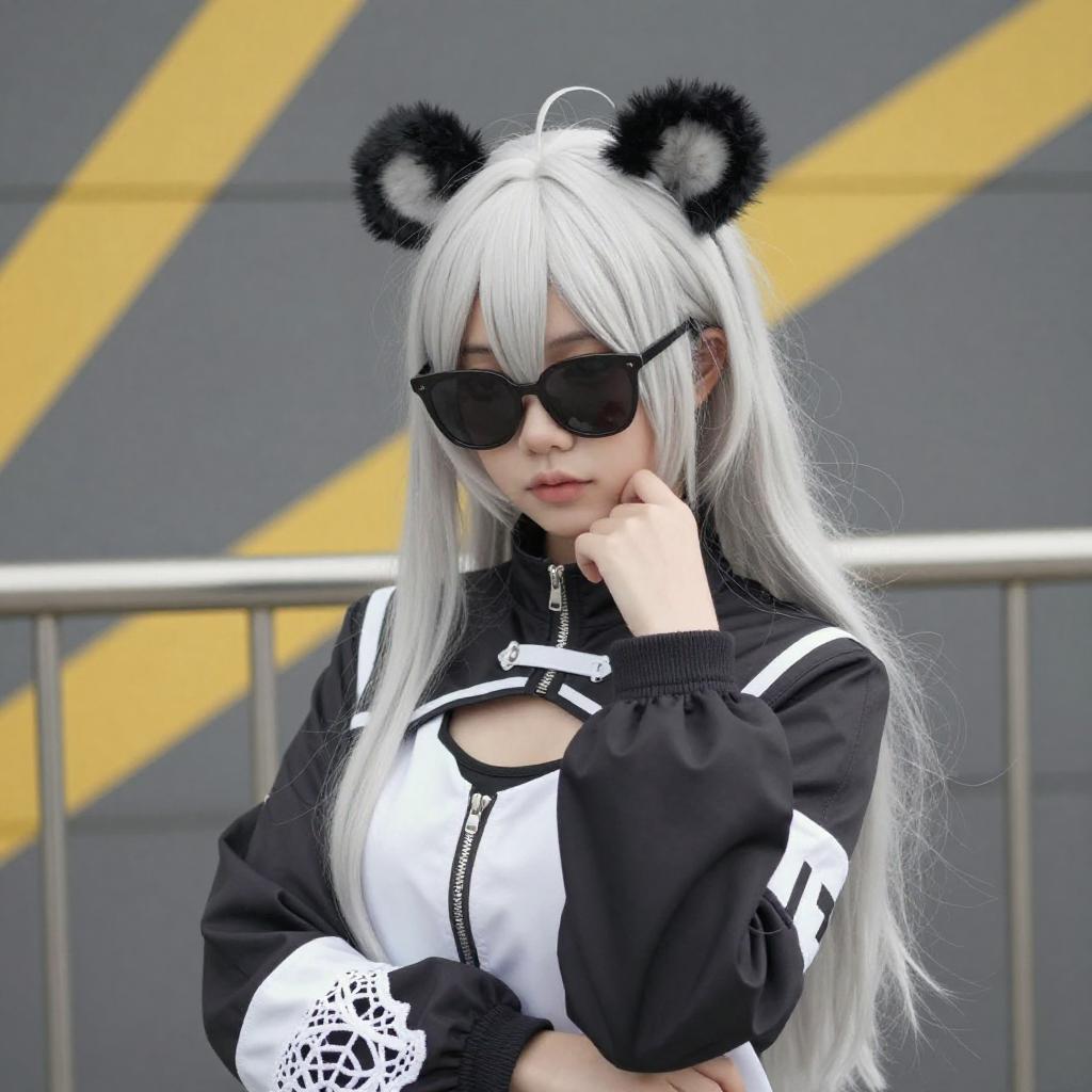 Photograph of an anime-style cosplayer with long, wavy silver hair, wearing a black, lace-patterned, off-shoulder top with a large circular cutout, and black bear-ear headband. She has dark sunglasses on her head, a playful smile, and is touching her hair with one hand. The background features a bright, colorful, geometric pattern with yellow and blue diagonal lines.