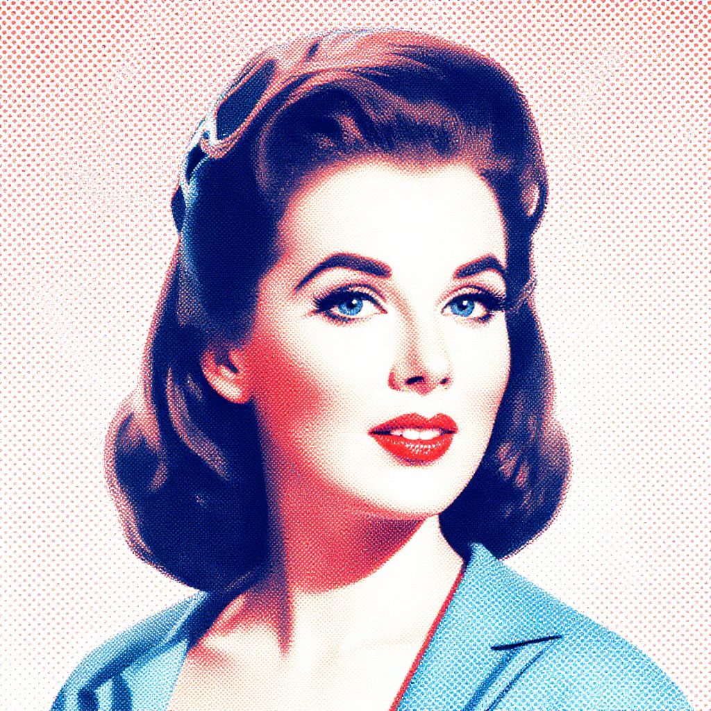 Benday dot matrix portrait of a 1950s woman, halftone color dots blending smoothly, stylized comic book look, bright reds and blues, subtle shadows and highlights, nostalgic mid-century graphic design