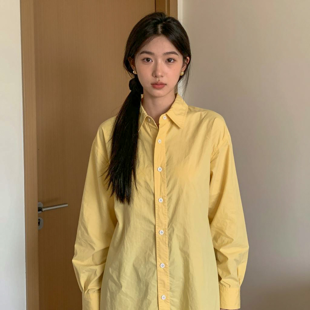 Yellow dress costume, photorealistic portrait of an Asian woman, standing, facing camera, yellow long-sleeve dress, buttons down the front, loose fit, long black hair in a low ponytail, neutral expression, minimal makeup, small gold earrings, indoor background, wooden door and beige wall in background, soft natural light, casual style, medium shot