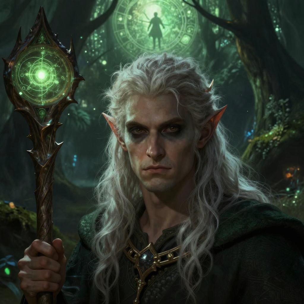 Realistic digital painting portrait of a gothic male druid with long white hair and elf ears, holding a glowing magical staff. Set in a dark, arcane forest filled with green light particles and mystical atmosphere, wearing an intricate wizard robe. The image features detailed skin texture and a fantasy astrology symbol glowing in the background.