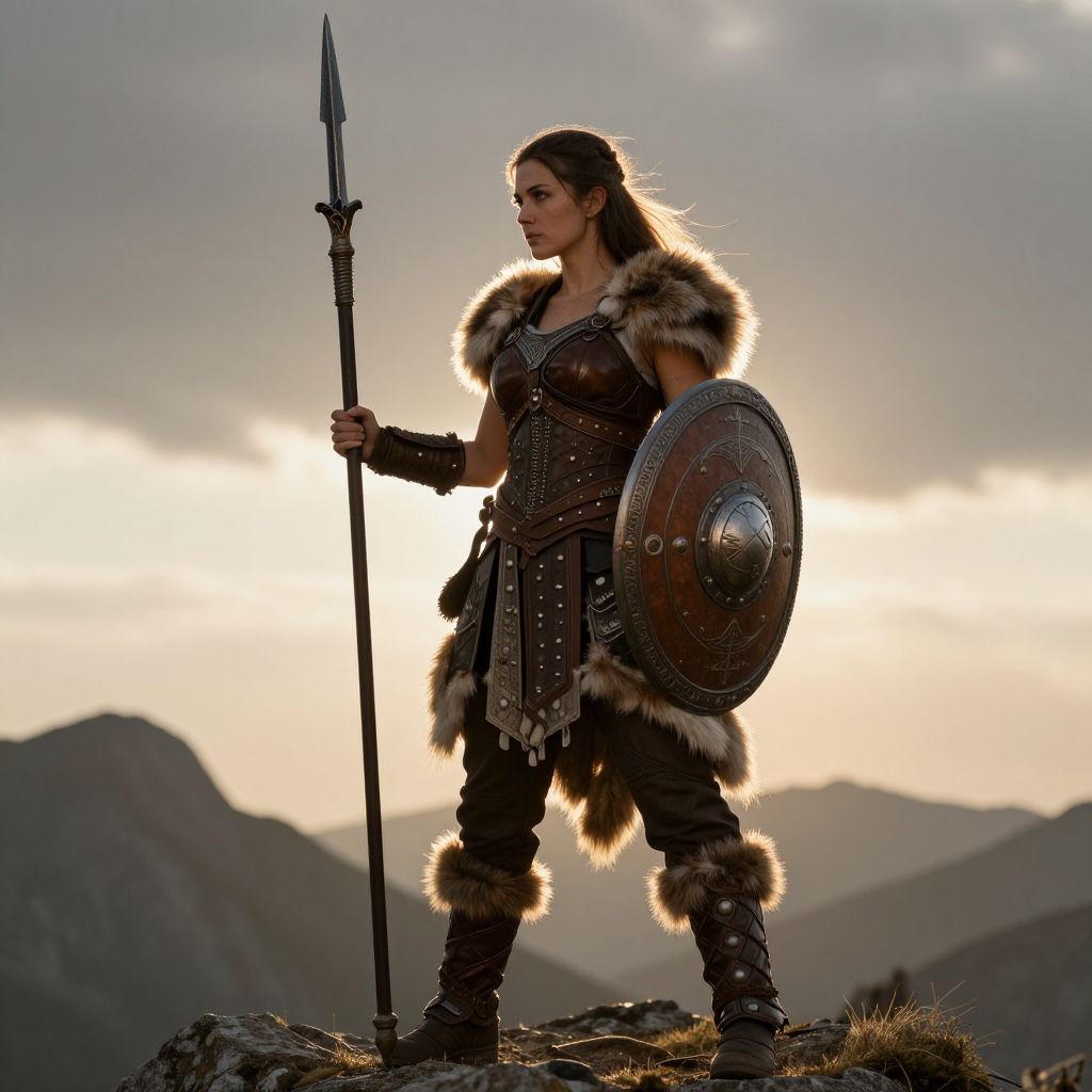 A warrior woman in leather and fur armor stands on a mountain, holding a shield and spear, with intricate details and a backlit, half-silhouette effect.