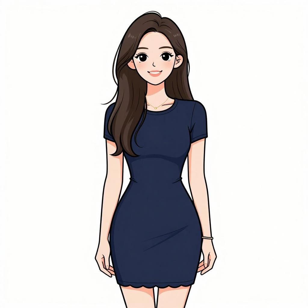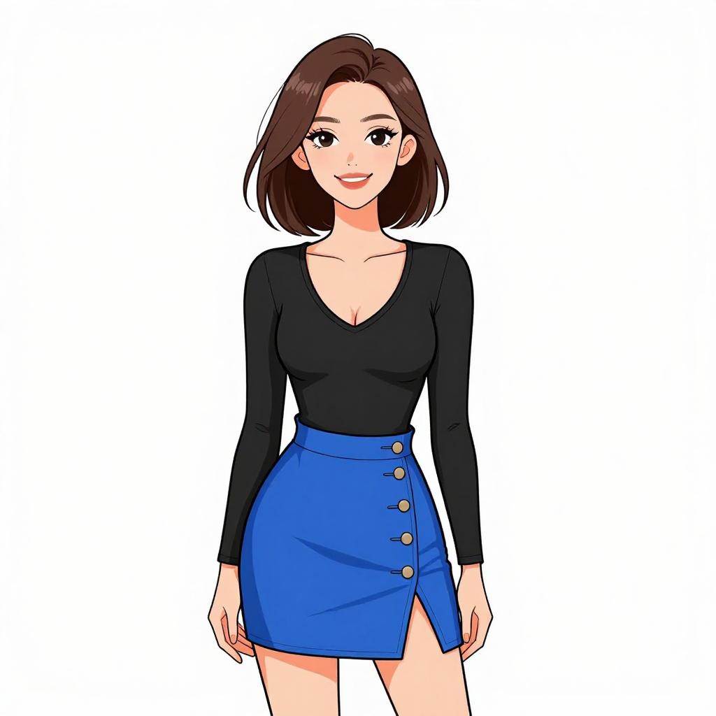 Woman with pretty face and pretty hair. smiling Woman, casual chic, black V-neck bodysuit with long sleeves, royal blue A-line mini skirt with side button detail, plain white background. --sref 1467
