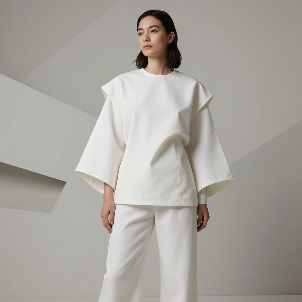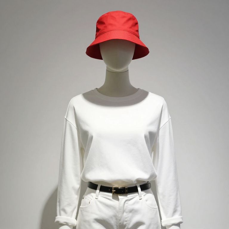Photograph of a faceless, gray mannequin wearing a bright red bucket hat, a shiny white long-sleeve shirt, and white pants with a black belt. The mannequin stands against a plain, light gray background. The red hat contrasts sharply with the white shirt and pants, creating a bold, minimalist look. The image is well-lit, highlighting the glossy texture of the shirt and the matte finish of the hat. The mannequin's smooth, featureless surface adds a modern, abstract feel to the composition.