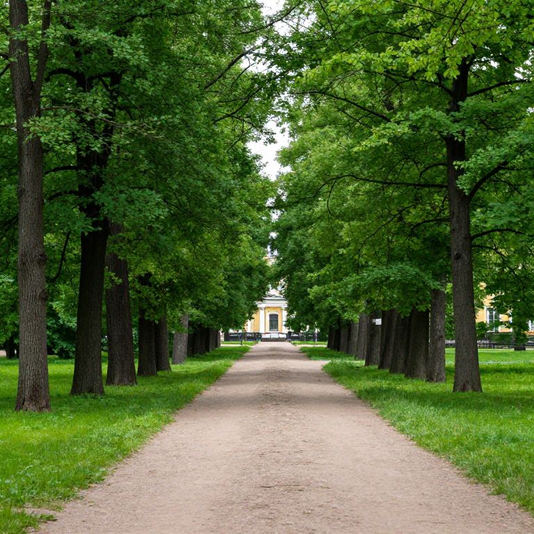 Lush green trees line both sides of a serene dirt path in Rampovaya Alley within Catherine Park, creating a tranquil canopy over the well-maintained grassy grounds near Pushkin Selo, just outside St. Petersburg, Russia.