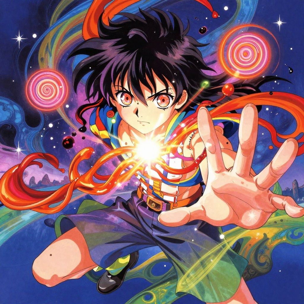 This vibrant digital anime-style illustration features a determined young male character with spiky black hair and intense brown eyes, extending his right hand forward with an outstretched index and middle finger, emitting a bright, glowing burst of light. He wears a blue and yellow striped sleeveless shirt, a dark blue skirt, and a belt with a square pouch. Red ribbons swirl around him, and two pink, glowing rings float in the background against a swirling mix of blue, purple, and green hues. The character's expression is focused, and his left hand is partially visible, clenched in a fist. The overall style is dynamic and energetic.