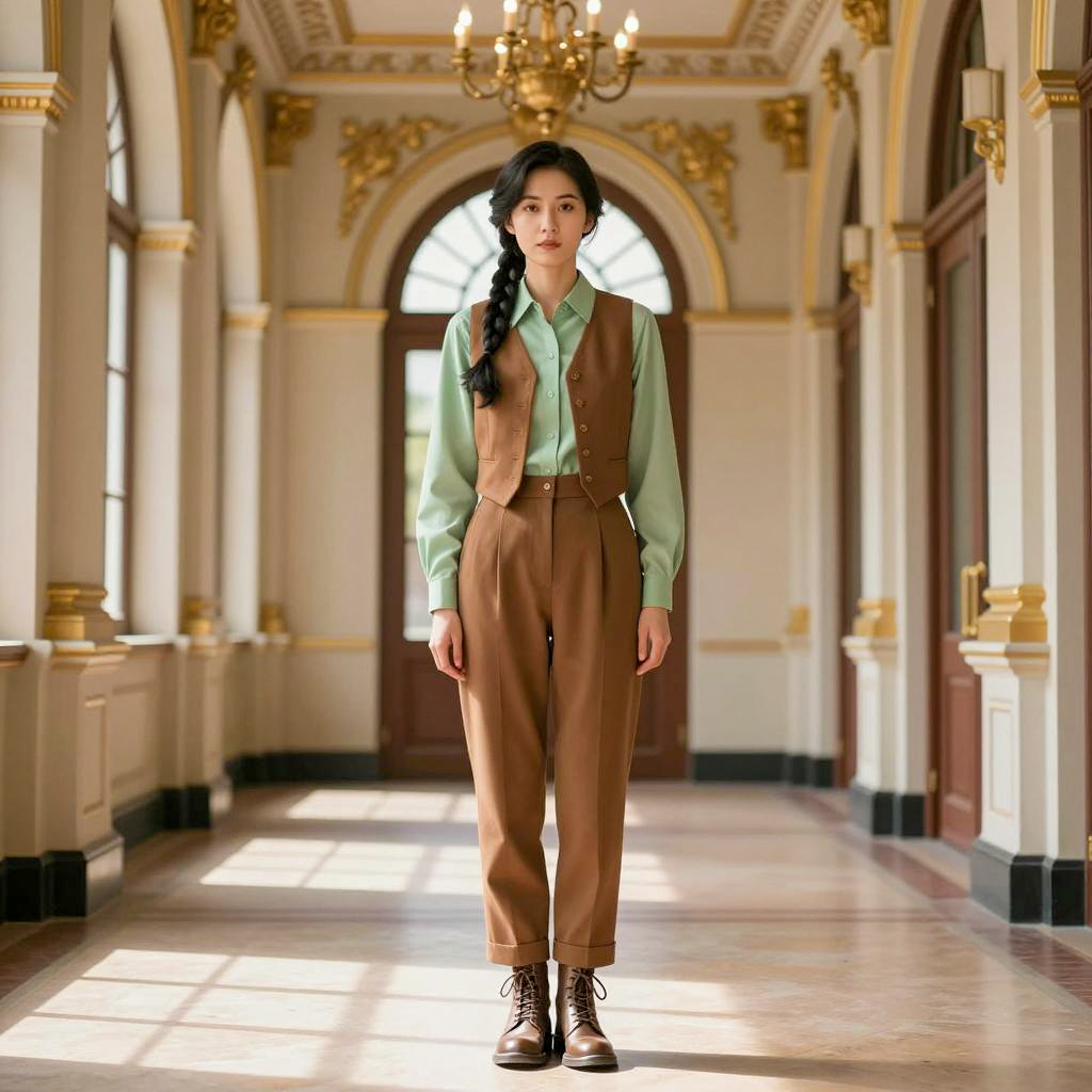 Photograph of a brick house with white columns. A woman in a light blue dress stands in the foreground, eating a lollipop. A man in a brown suit stands near the doorway, and a woman in a white dress stands inside the doorway. Bushes are on both sides of the steps.