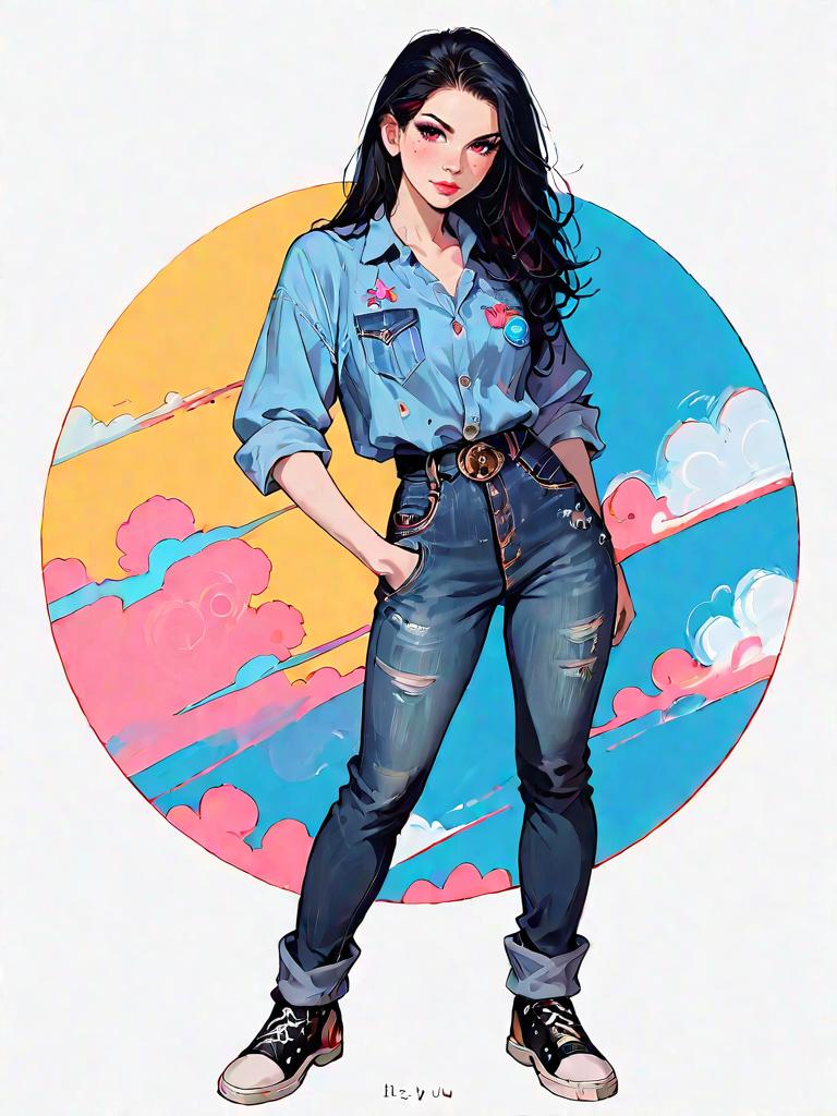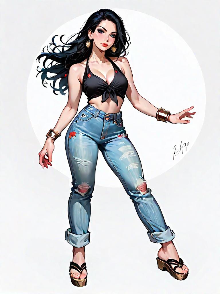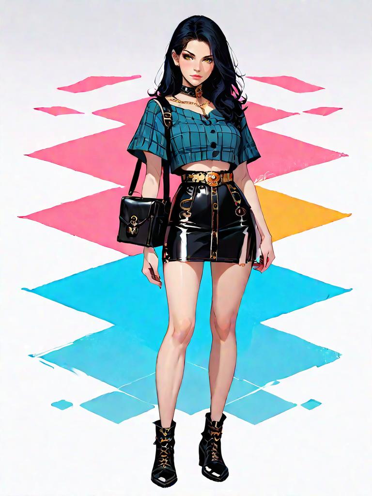 1girl, source_comics, realistic face, full body shot, Woman, minimalist, sleeveless black turtleneck top with side lacing detail, fitted black faux leather pants with ribbed knee texture, simple gold bracelet.