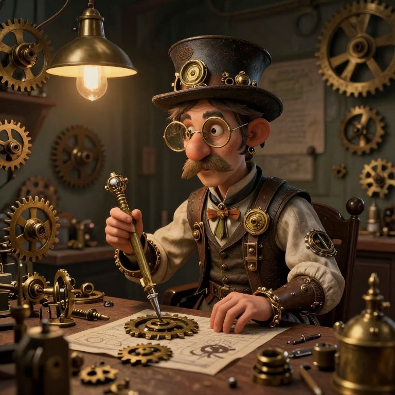A digital illustration depicts a steampunk inventor with a mustache and round glasses, wearing a black top hat adorned with a clock gear and a brown leather vest over a white shirt. He sits at a wooden desk, holding a brass pen over a blueprint with gears, surrounded by various mechanical parts and gears. A brass lamp with a glowing bulb illuminates the scene, casting a warm light. The background includes a blurred chalkboard and more gears on the wall, enhancing the intricate, industrial atmosphere. The inventor's focused expression and detailed attire create a Victorian-era, clockwork-inspired aesthetic.