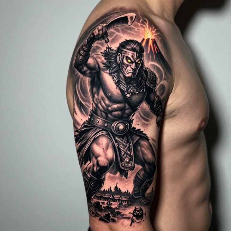 The image showcases a highly detailed and realistic tattoo on a person's bicep. The tattoo features a muscular Maori warrior god in a fighting pose, with a fierce expression and glowing gold eyes that stand out against the black and grey color scheme. The warrior is adorned with intricate patterns and designs on his armor, which includes a loin cloth and a weapon he is brandishing. In the background, a silhouette of a village can be seen, and further back, an erupting volcano with glowing lava adds a dramatic touch to the scene. The tattoo is executed in a comic book style, with a digital design that enhances the realism and depth of the artwork. The overall composition is dynamic, with the warrior positioned centrally and the village and volcano creating a sense of depth and perspective. The tattoo is ultra-realistic and highly detailed, with a 8k resolution that captures every nuance of the warrior's muscular physique and the intricate patterns on his armor.