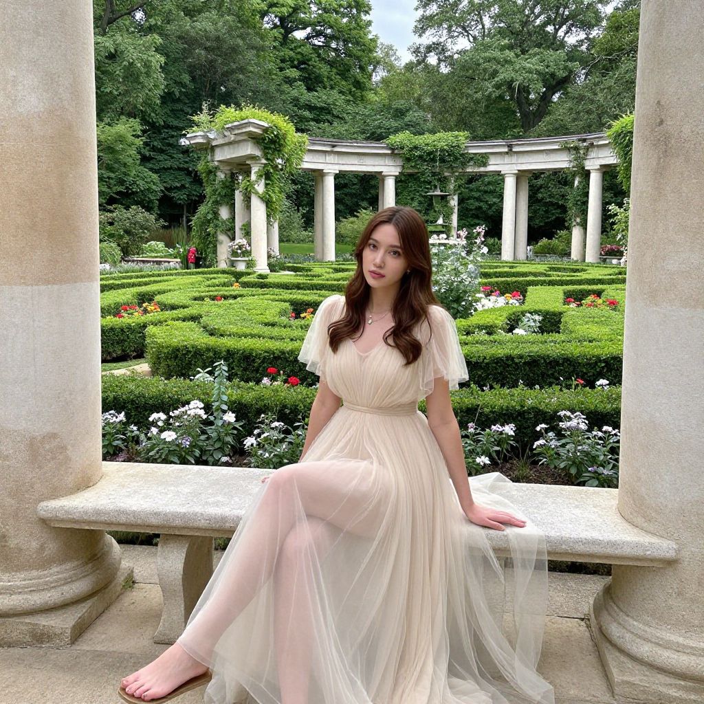 A young woman in a gauzy tulle gown sits on a stone bench in a lush, manicured garden with tall pillars and mazes, surrounded by vibrant greenery and flowers.