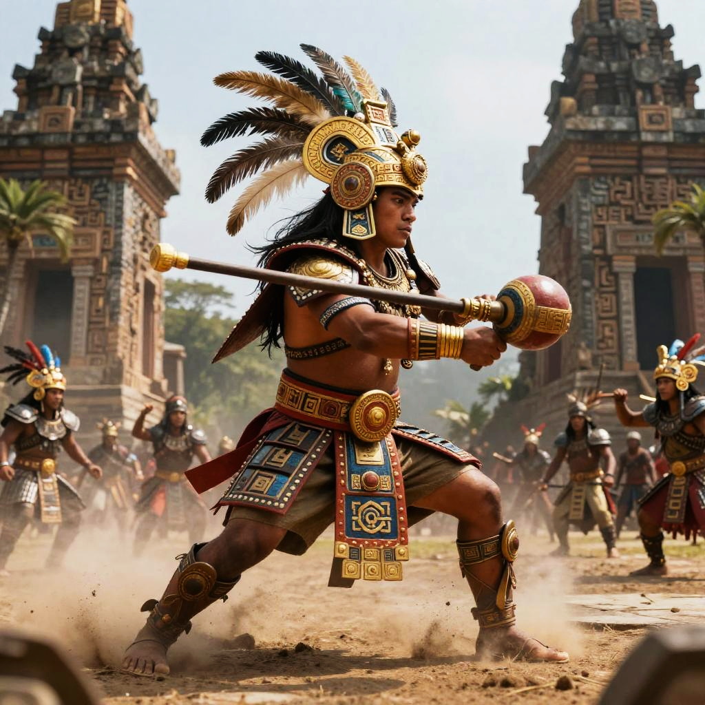 Photograph-style CGI of a muscular, dark-skinned warrior in traditional Mayan attire, wielding a large, ornate club. He wears a gold and feathered headdress, intricately decorated armor, and a colorful loincloth with geometric patterns. His stance is aggressive, with dust kicking up around his feet. In the background, other warriors in similar attire stand before ancient stone temples with detailed carvings. The scene is set in a sunlit, open area with palm trees in the distance, creating a vibrant, historical ambiance. The image has a realistic, action-packed feel with sharp details and dynamic lighting.