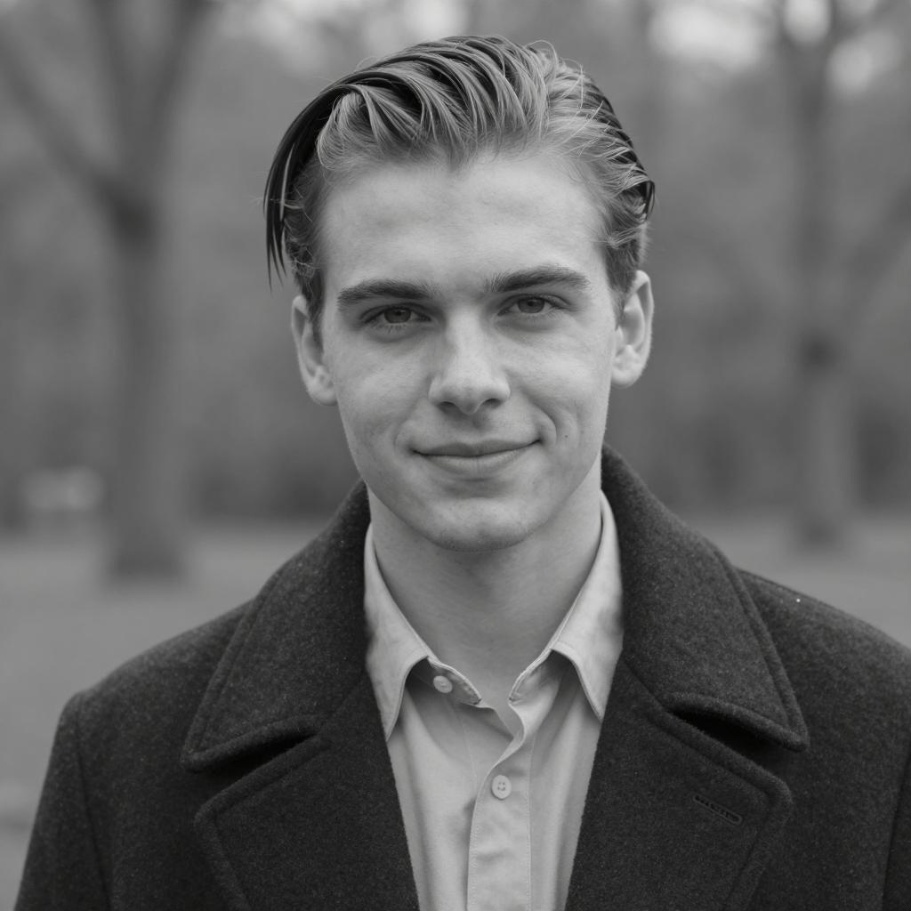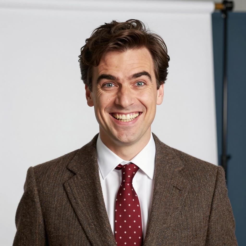 Photograph of a man with short brown hair, fair skin, and a slight smile, looking through a blue-framed window. He wears a red shirt. Frosty windowpane covers lower part of window. Plaid curtains on both sides. Dimly lit indoor background. Man centered in frame.