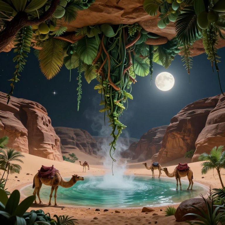 A jungle grows upside-down from the ceiling of a moonlit desert canyon, where floating camels sip from vapor lakes and gravity-defying vines hum lullabies.