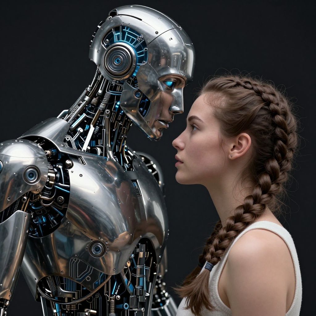 Photorealistic CGI: Human woman with braided brown hair in white tank top faces futuristic, silver robotic humanoid against dark background.