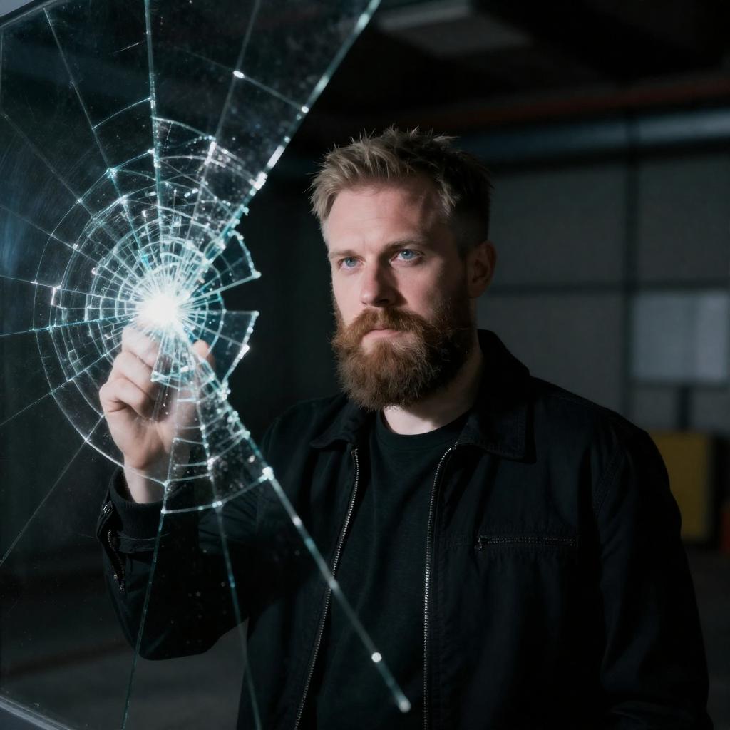 Photograph of a bearded man with short, blonde hair and blue eyes, wearing a black jacket, standing in front of a shattered glass window. His reflection is distorted in the broken glass, which emits a bright blue light. The background is dark and industrial.