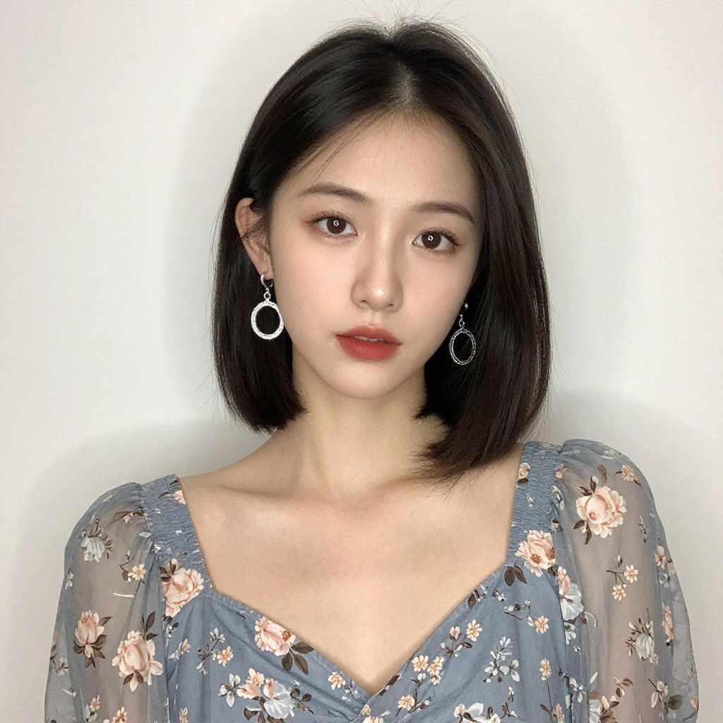 Photorealistic digital portrait of a young Asian woman with short, dark brown hair, wearing a black turtleneck, and silver earrings, against a
