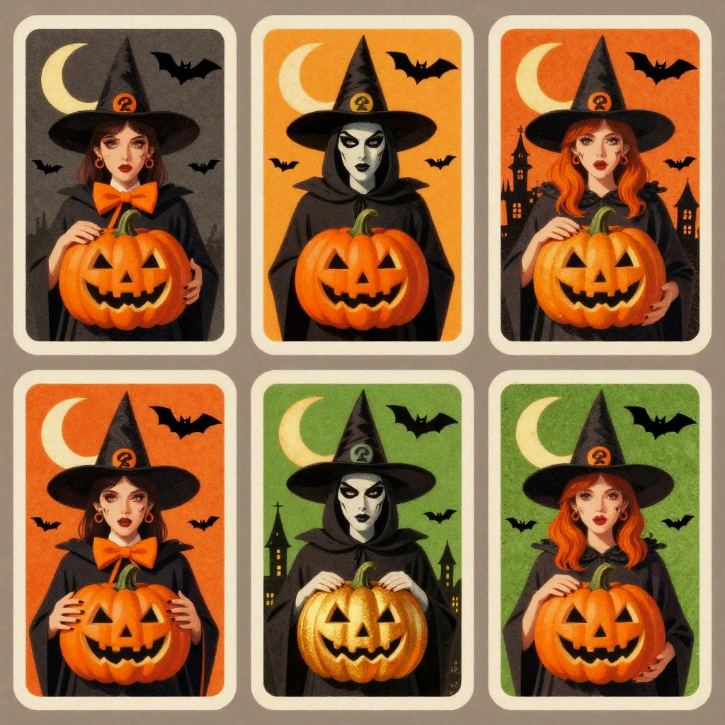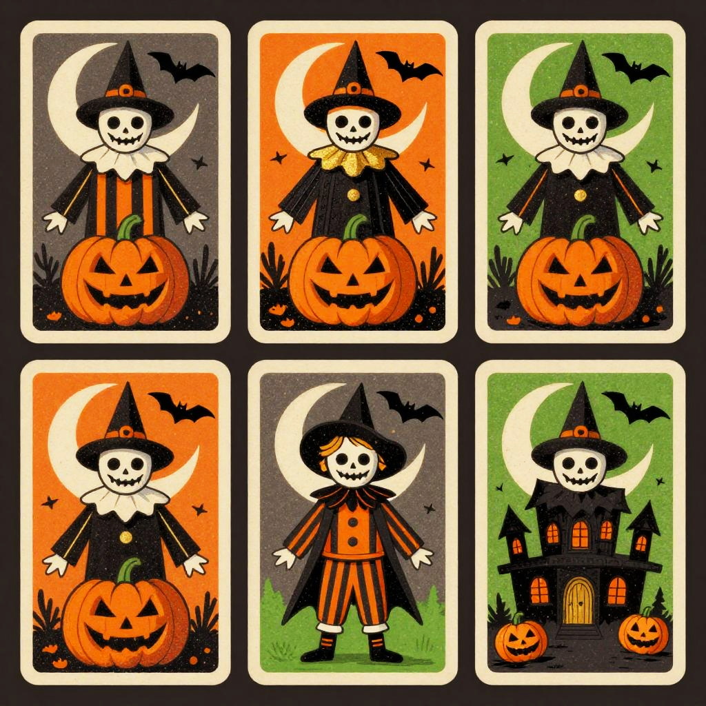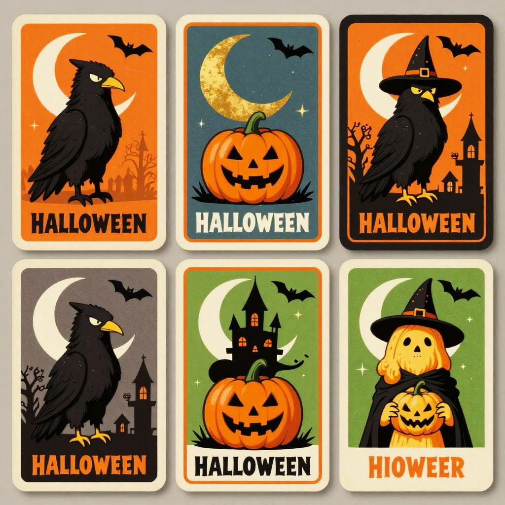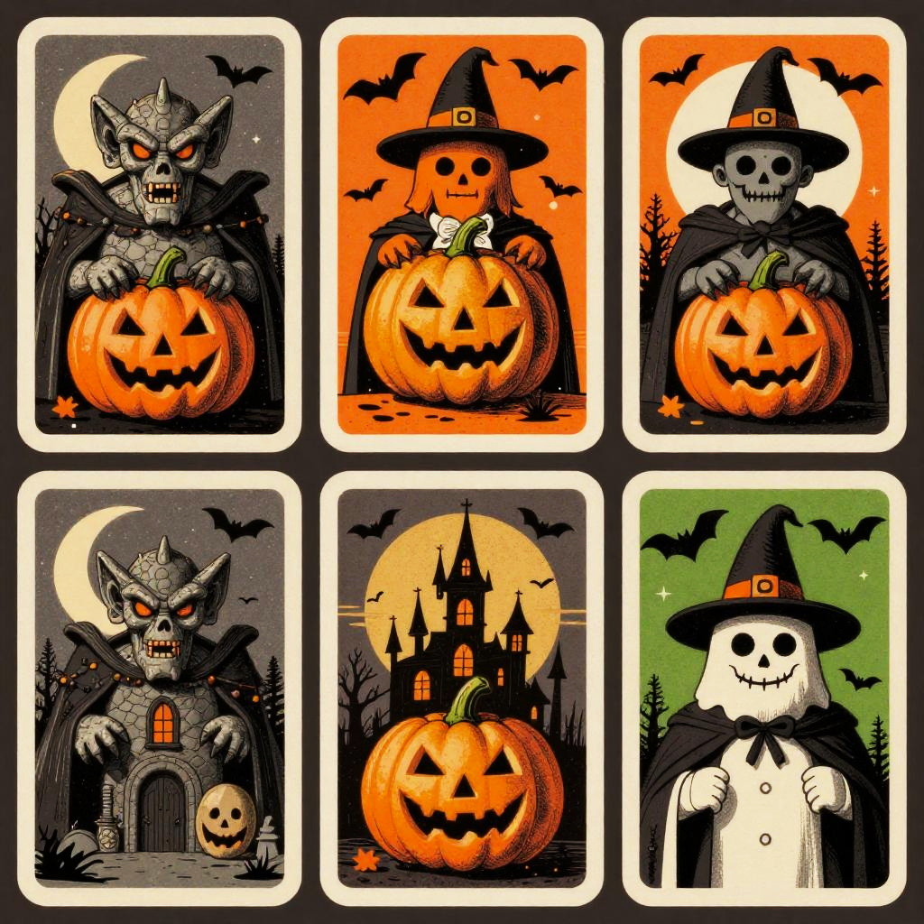 Retro Halloween characters set against trading card backgrounds, featuring a vivid color palette of blacks, oranges, golds, greens, and grays. Each card showcases a unique character, like a sinister werewolf, with a crescent moon, bats flying, and a haunted house in the background. The style is nostalgic, with bold colors and detailed vintage textures, capturing a classic Halloween ambiance. Each card has a spooky yet playful look, perfect for a retro Halloween collection.