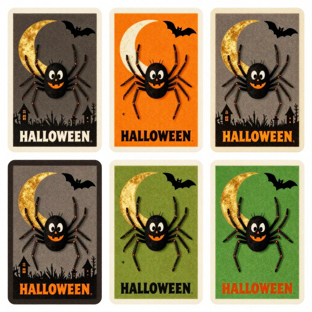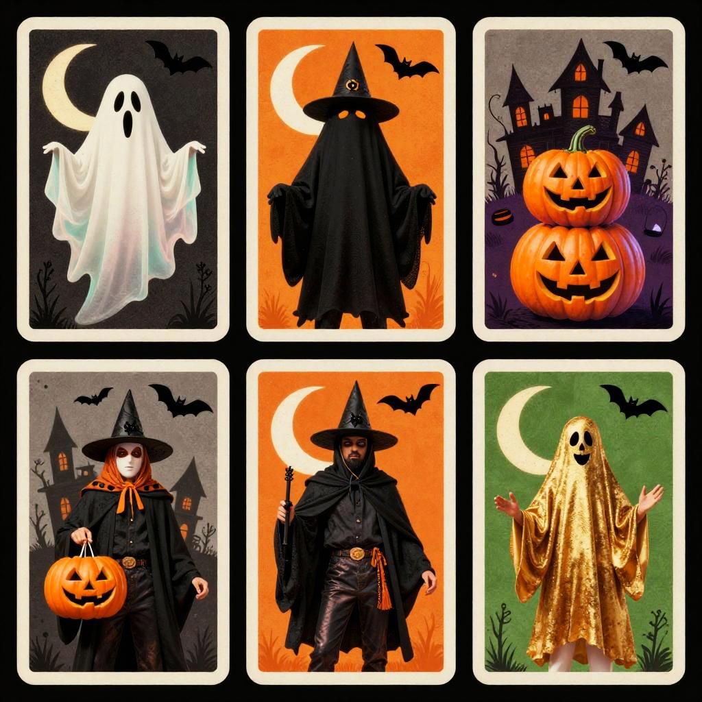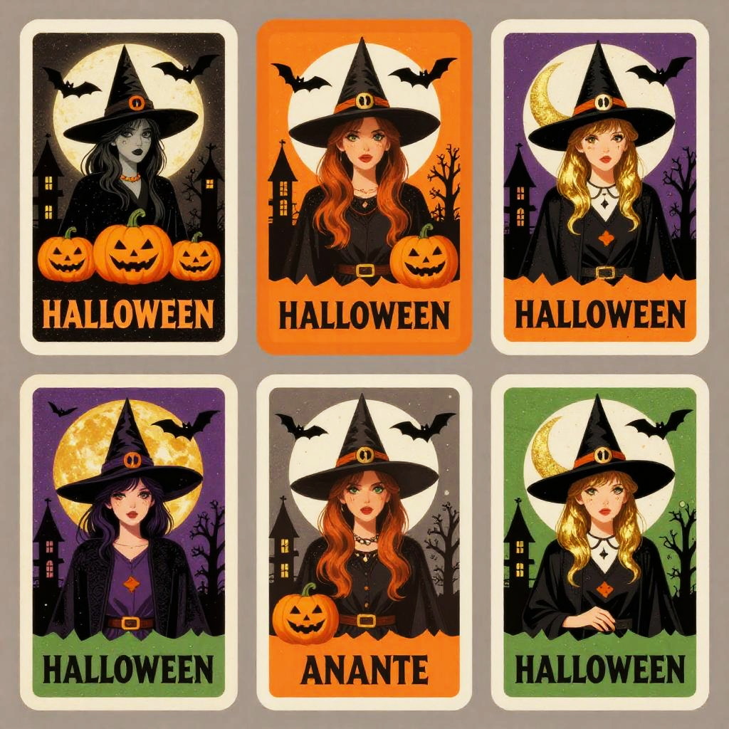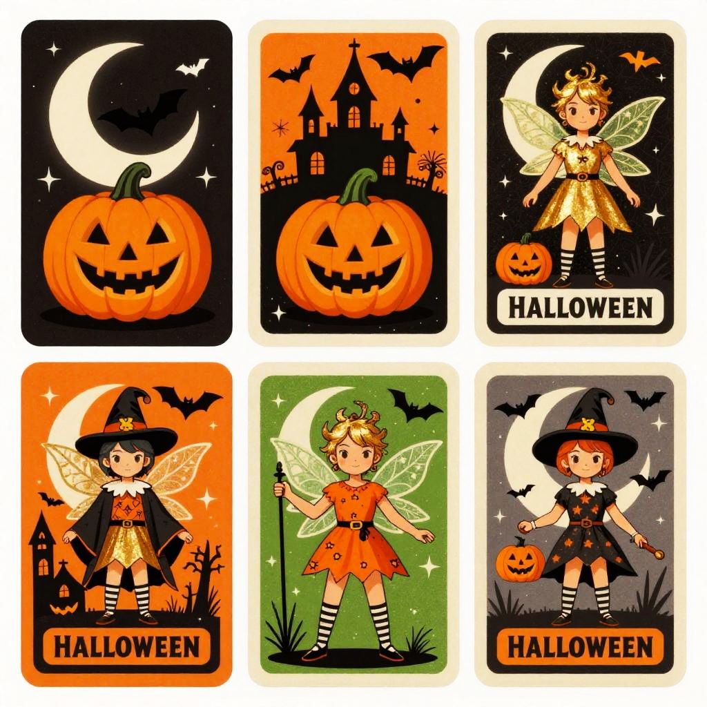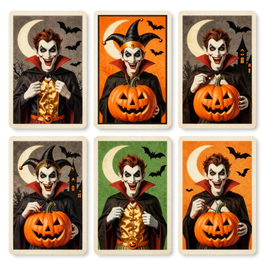 Retro Halloween characters set against trading card backgrounds, featuring a vivid color palette of blacks, oranges, golds, greens, and grays. Each card showcases a unique character, like a sinister werewolf, with a crescent moon, bats flying, and a haunted house in the background. The style is nostalgic, with bold colors and detailed vintage textures, capturing a classic Halloween ambiance. Each card has a spooky yet playful look, perfect for a retro Halloween collection.
