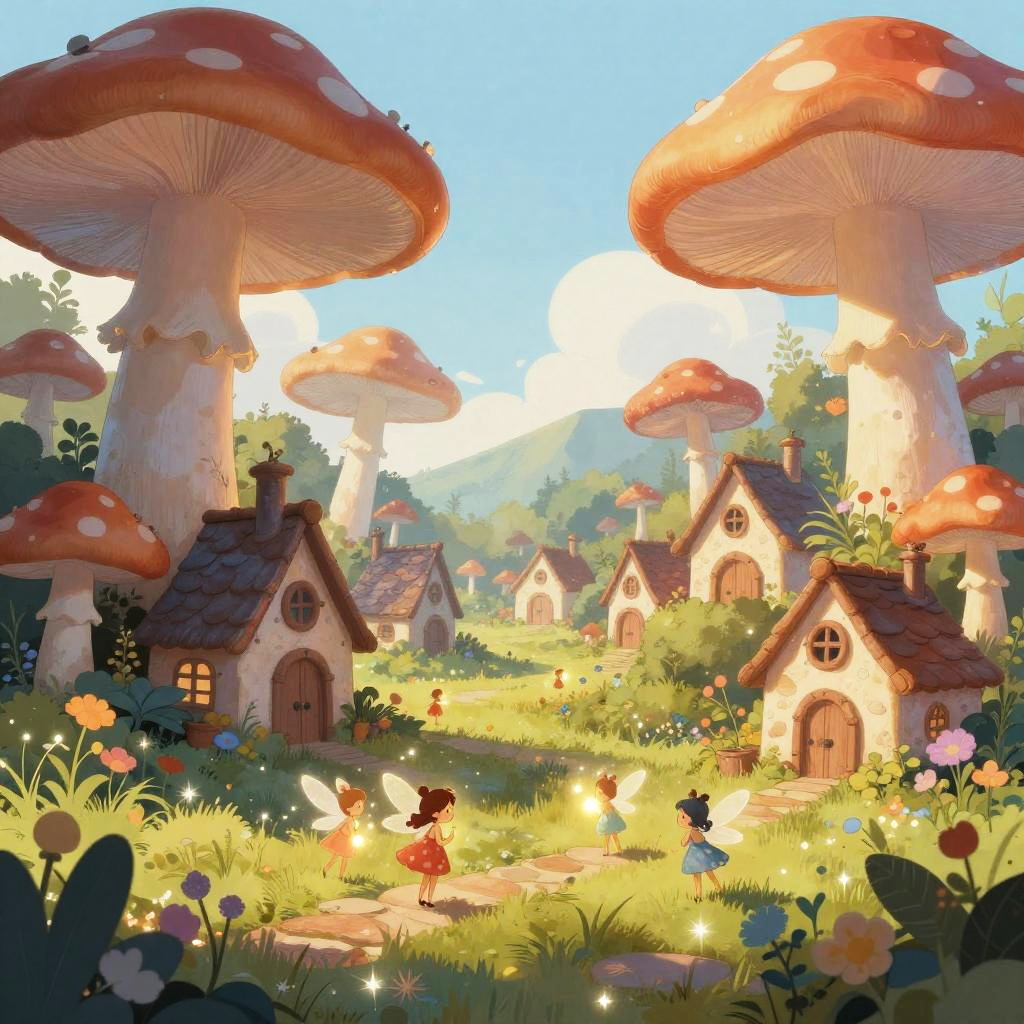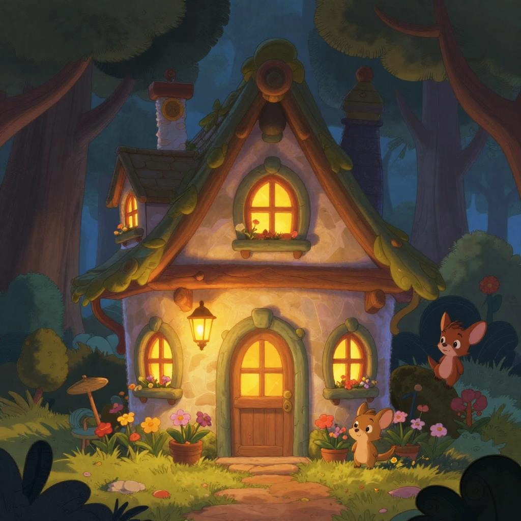 Whimsical, brightly-lit fairy-tale cottage in a dark forest, with glowing windows, colorful flowers, a deer, and a small mouse