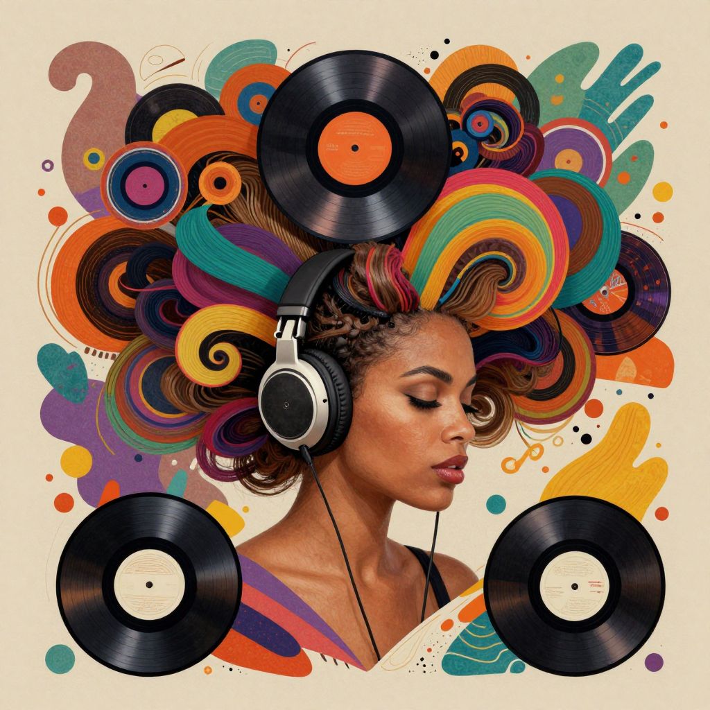 The image depicts a vibrant and dynamic scene with a central figure adorned with an elaborate hairstyle featuring colorful vinyl records. The woman's hair is styled in an intricate, swirling pattern, with each record adding a unique hue and texture. She is wearing large, round headphones, suggesting a connection to music or sound. The background is a riot of colors, with abstract shapes and patterns that create a sense of movement and energy. The overall composition is rich in texture, with the smooth, glossy surface of the vinyl records contrasting against the more organic, natural elements of the woman's hair. The scene conveys a sense of groove and soul, with the woman appearing to be in a state of deep engagement with the music. The use of warm, earthy tones and the organic shapes of the vinyl records evoke a sense of community and connection, as if the woman is part of a larger musical scene. The image is a celebration of music, with the woman at the center of the groove, surrounded by the vibrant energy of the vinyl records and the abstract patterns of the background.