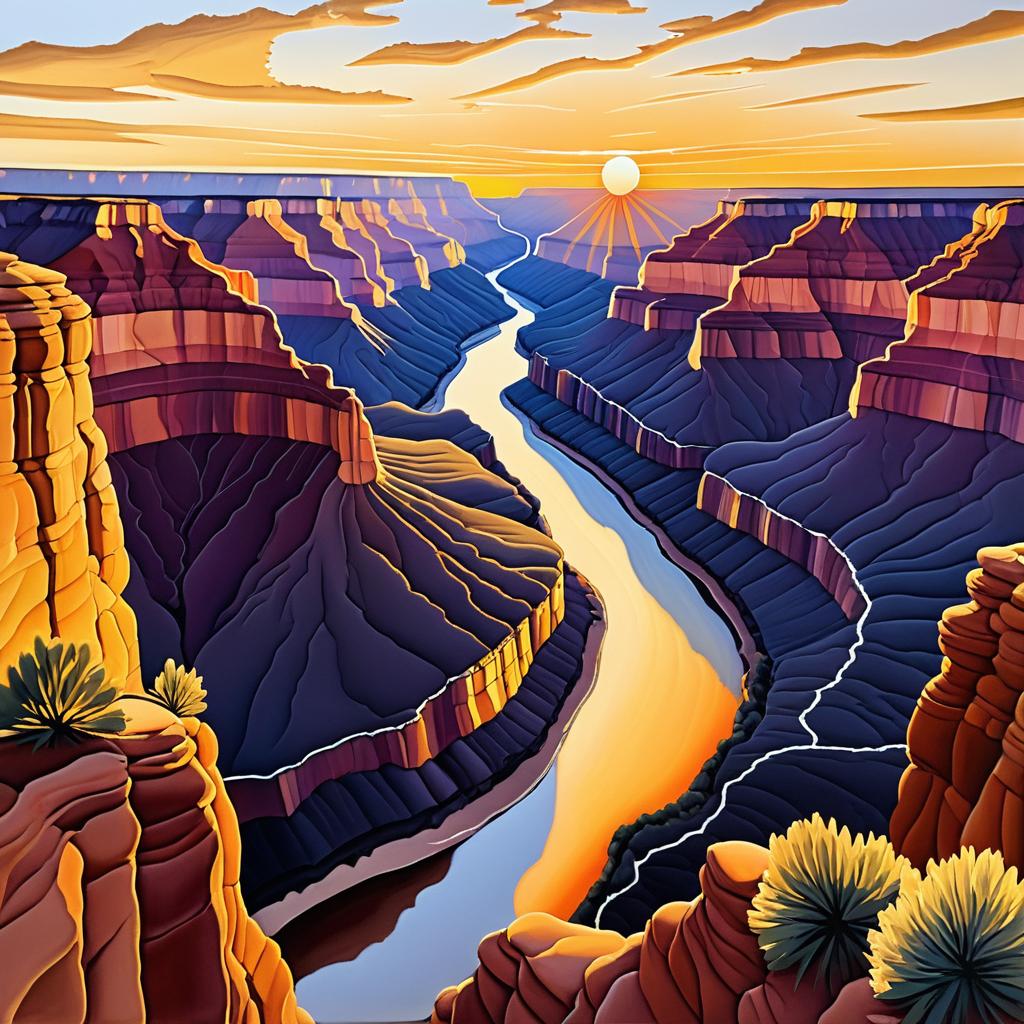 Fine detail painting of the Grand Canyon at sunset, inspired by the style of Georgia O'Keeffe. The artwork features intricate and ornate elements with vibrant colors highlighting the canyon's layered rock formations and the river winding through the landscape under a dramatic sky.