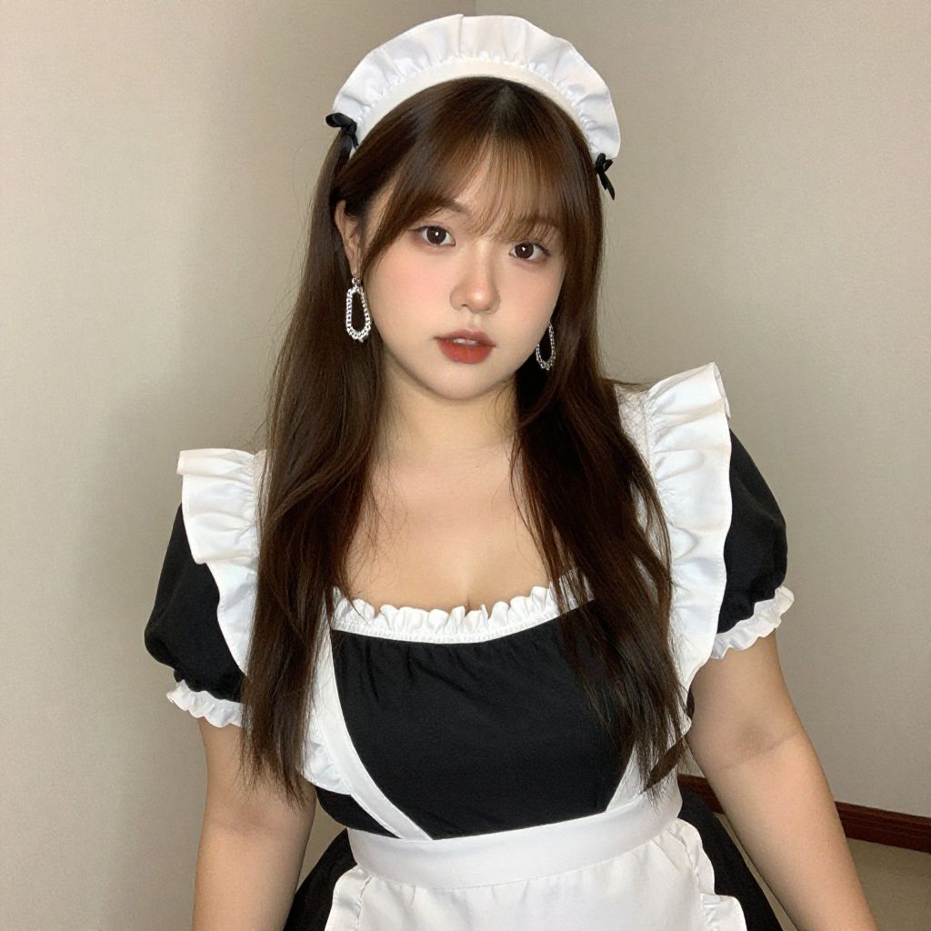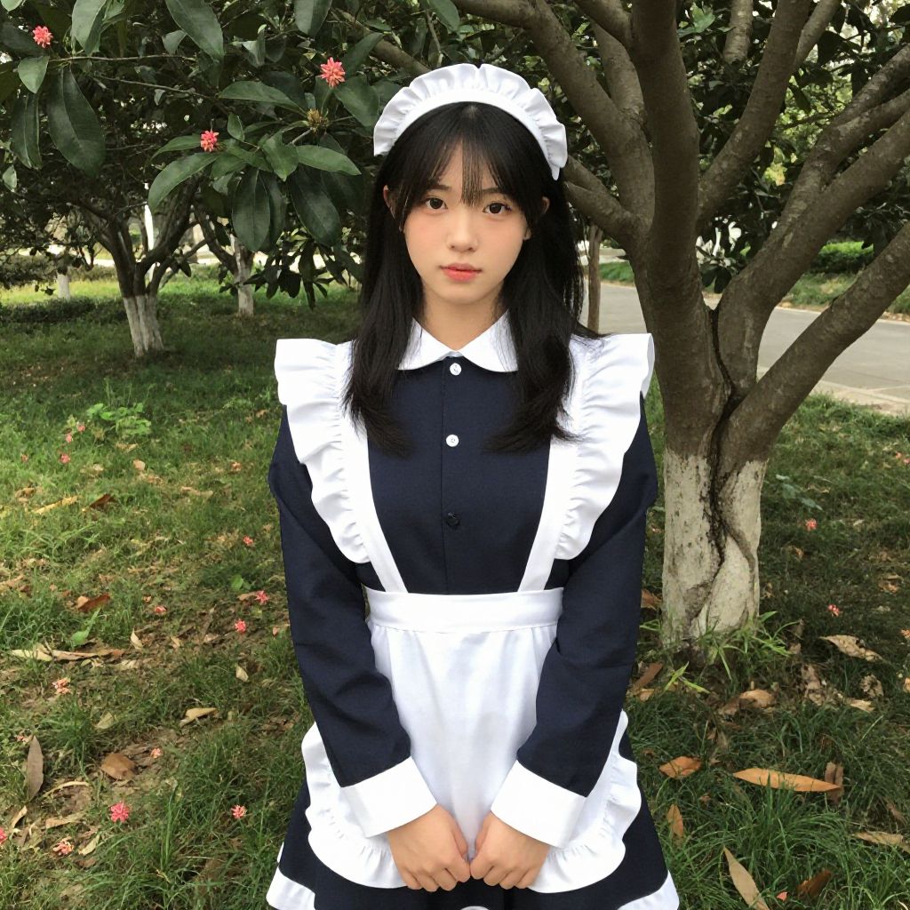 Photograph of an Asian woman with long dark hair, wearing a black and white maid outfit, including a frilled headpiece, standing outdoors on a