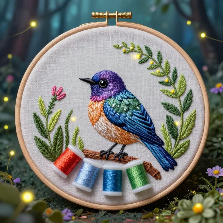 Colorful hand-stitched embroidery featuring a light brown-haired bearded man riding a large mastiff dog. The man is holding a staff and is accompanied by a bright blue and orange kingfisher bird. The stitching uses detailed thread work on a white fabric background.