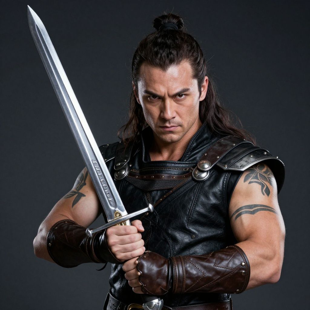 Photograph of a muscular man with long black hair in a topknot, wearing black leather armor and holding a silver sword, with a serious expression