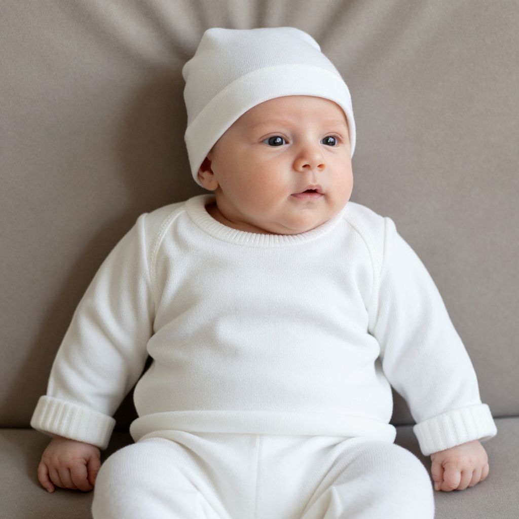 Newborn Organic Cotton Clothes Costume, a close up of a baby wearing a white sweater and pants