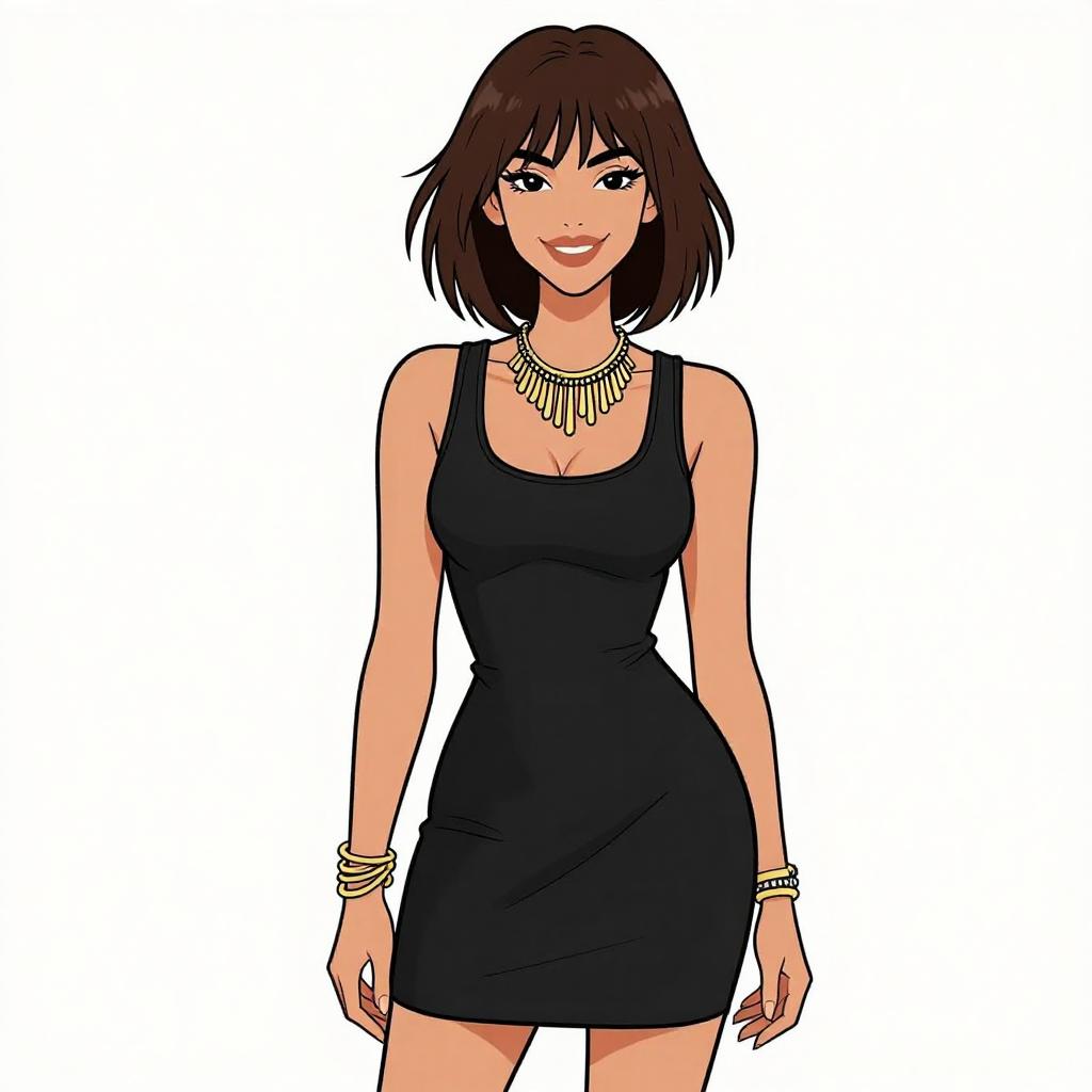 Digital illustration of a young woman with fair skin and shoulder-length brown hair. She has a slender build and is wearing a form-fitting, long-sleeved black dress with a red stripe running down the sides. The dress has a small cutout at the chest. She is also wearing black ankle boots. Her expression is neutral with a slight smile, and she stands confidently against a plain white background. The art style is clean and vibrant, with bold lines and flat colors, typical of modern digital character illustrations.