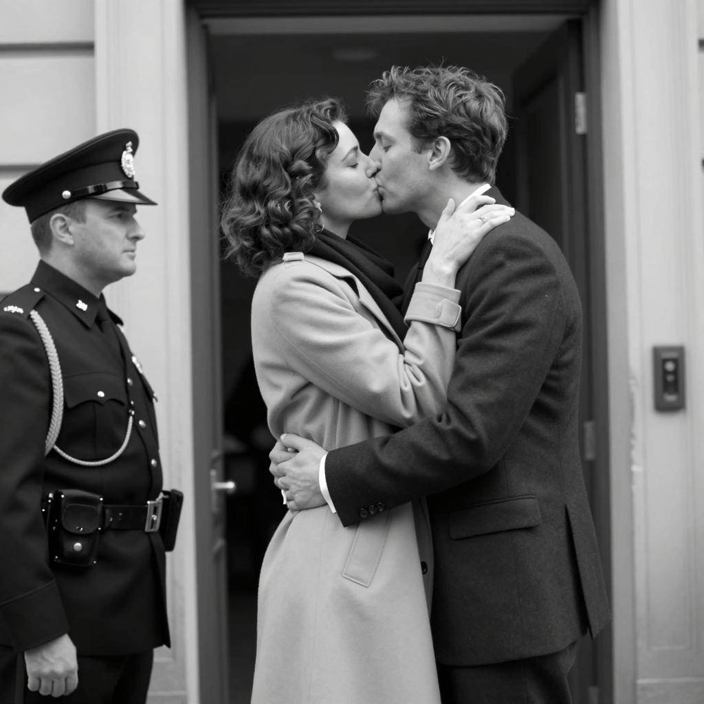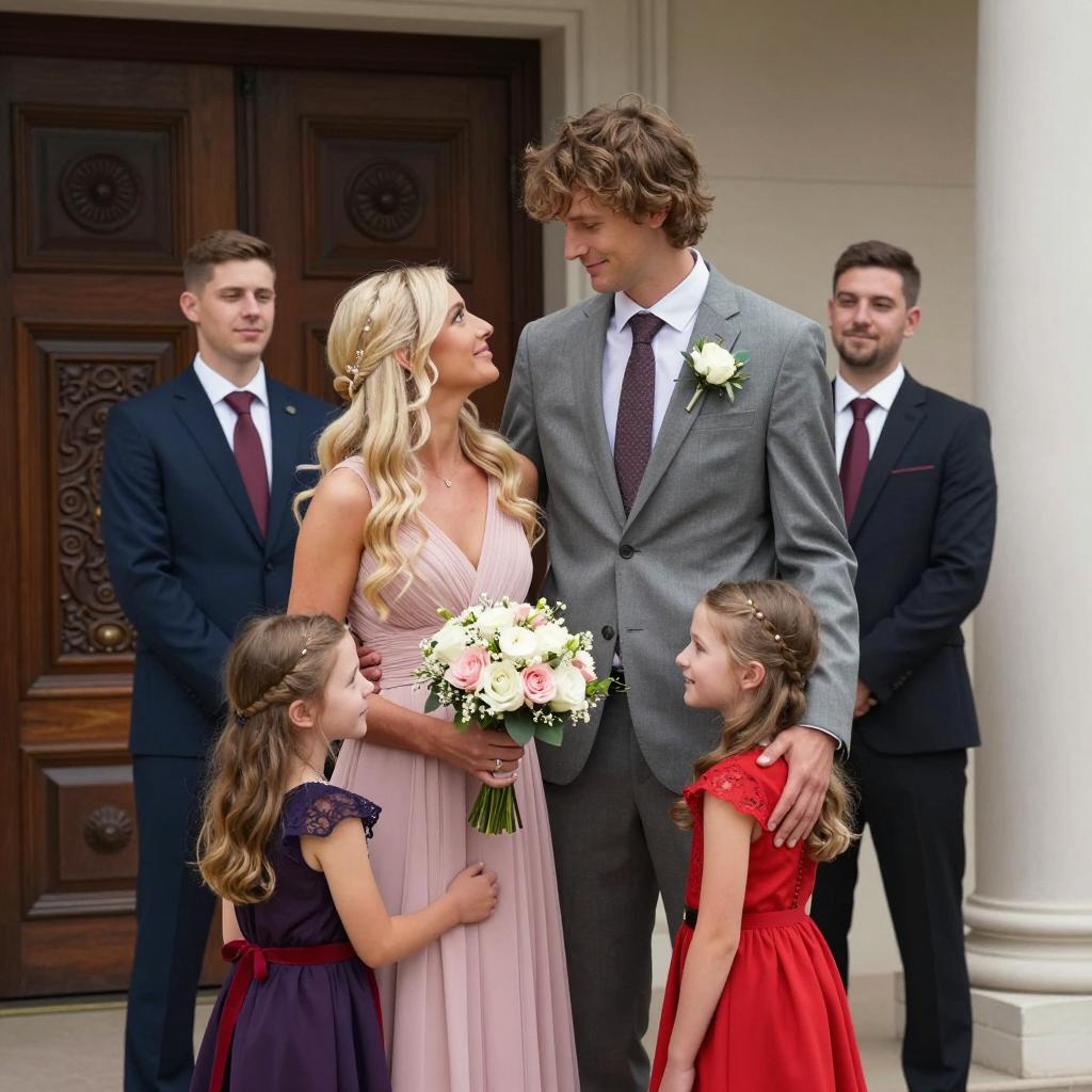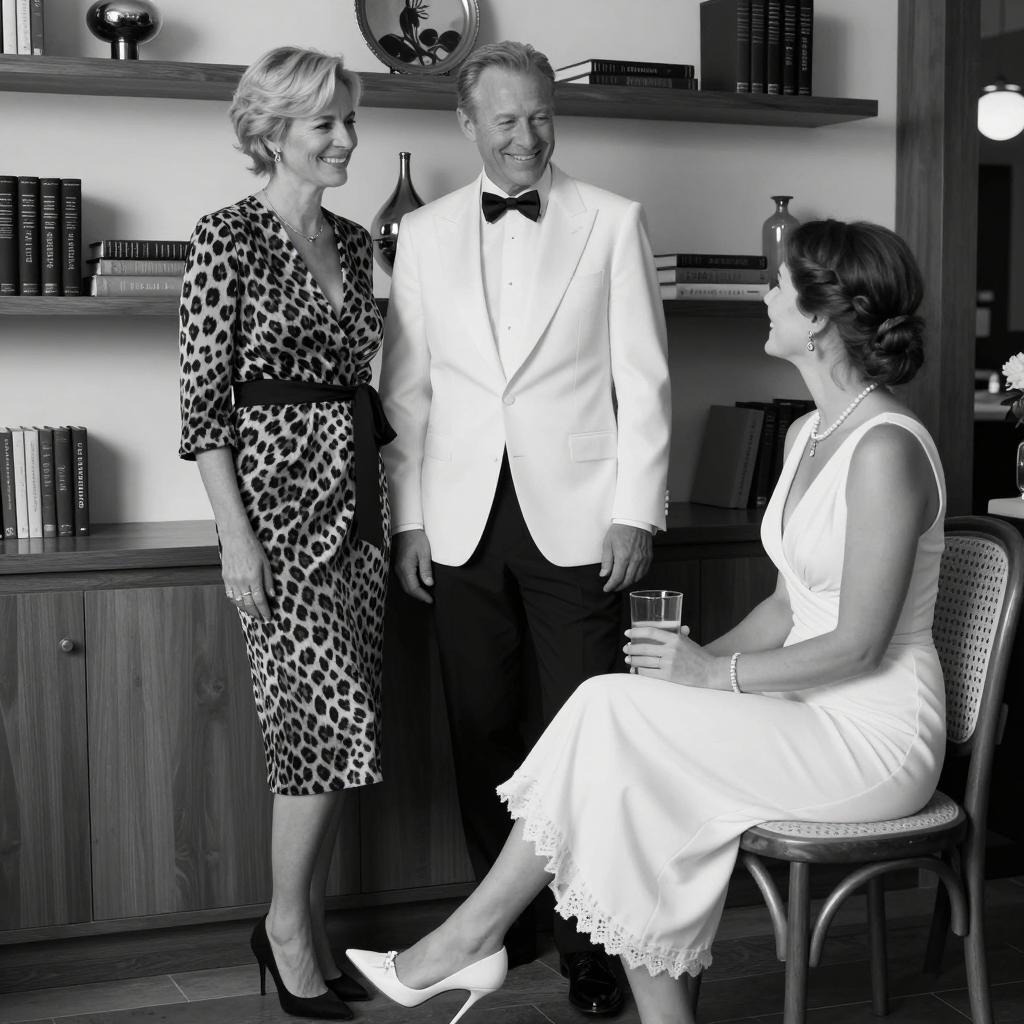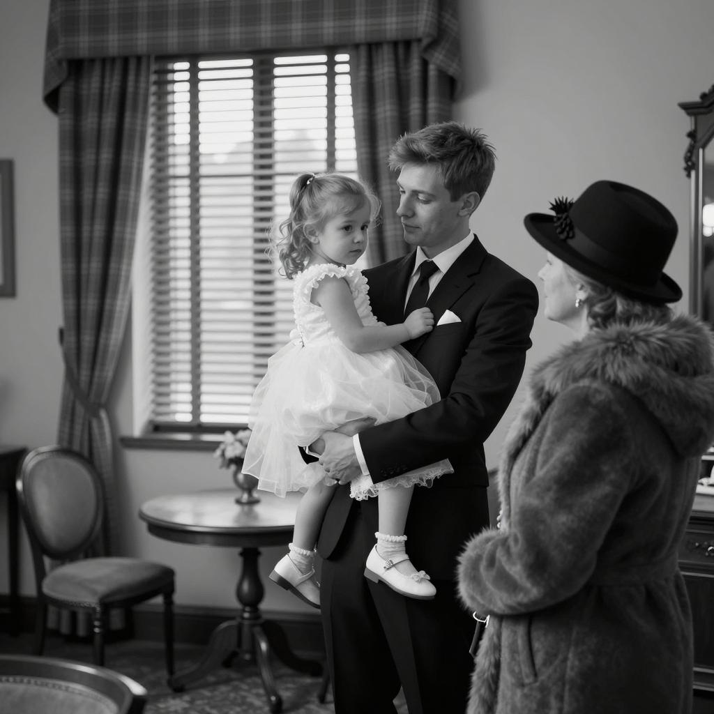 Black-and-white photograph. Young man in dark suit, holding young girl in white tulle dress, standing in plaid-draped room. Older woman in fur coat, hat, standing in foreground, facing them. Background: window blinds, small table, chairs. Intimate, formal setting.