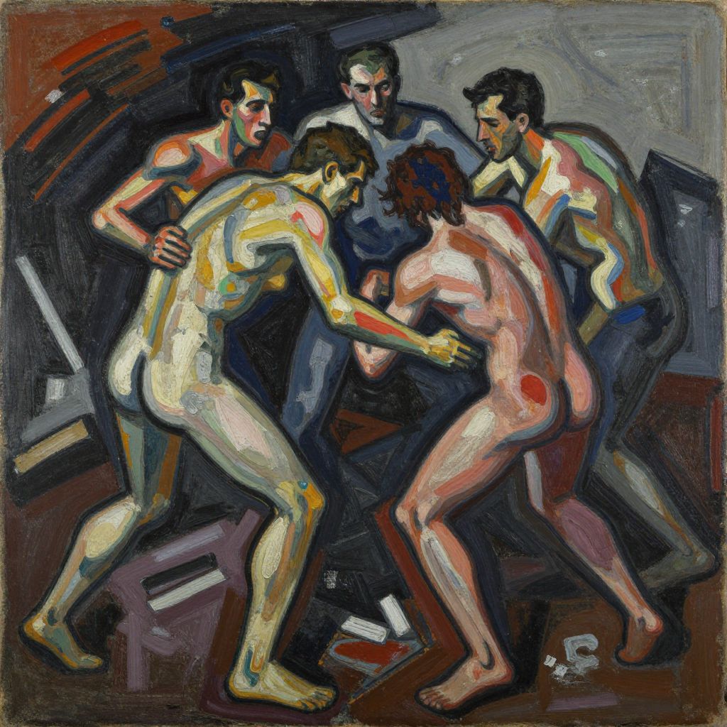 This is a painting in an Expressionist style, featuring four nude men with muscular builds in a dark, abstract room. The men have varied skin tones, with one having a noticeable red mark on his buttocks. They are positioned in a dynamic, almost aggressive interaction, with two men on the left and right grabbing the central figure, who is bent forward. The background is filled with dark, bold brushstrokes in shades of black, red, and gray, adding to the intense atmosphere. The painting uses vivid, contrasting colors and thick, expressive lines to convey a sense of movement and tension.