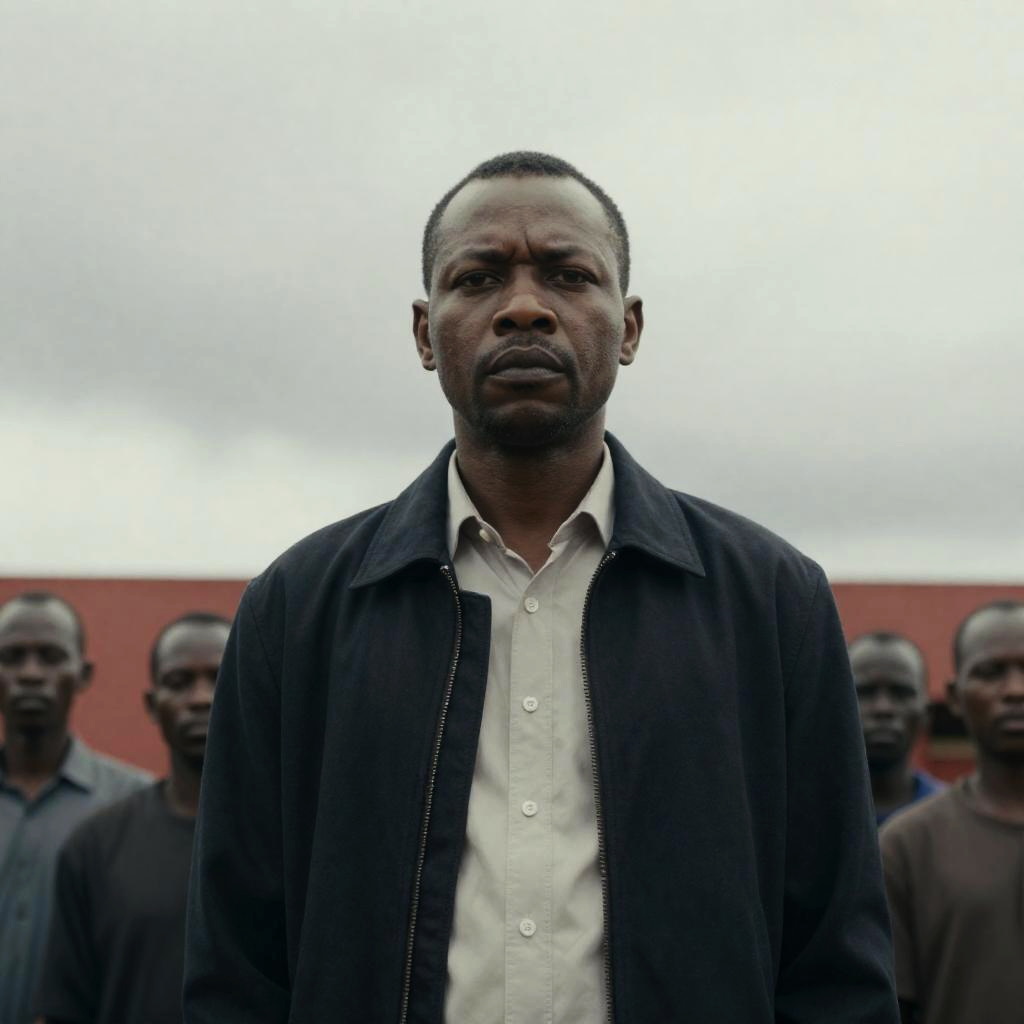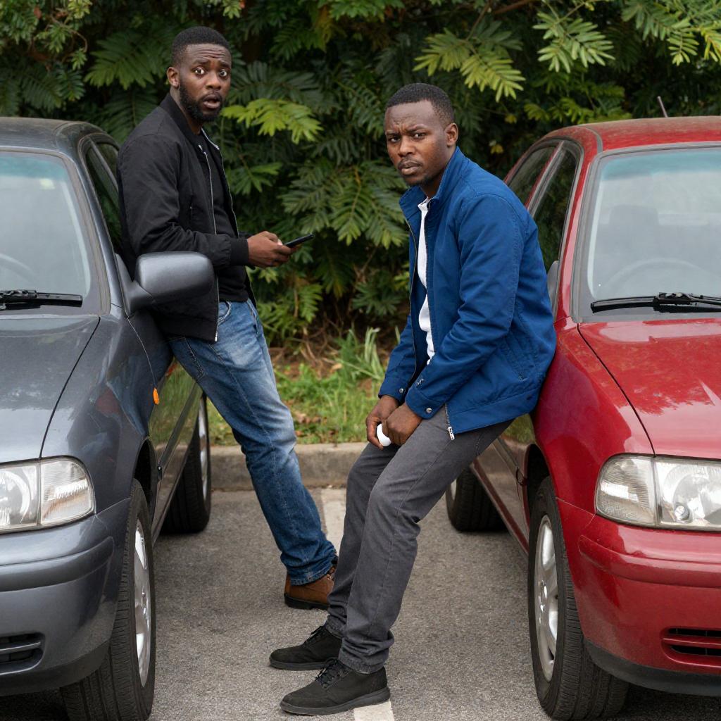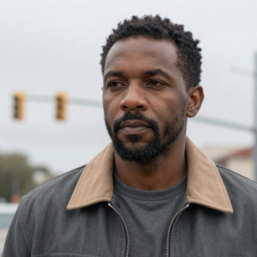 Urban street scene featuring a dark-skinned man wearing a green coat, black hoodie, and sunglasses standing beside a pole with a sign. Two boys walk past him; one wears a blue tank top and cap, the other a yellow and black striped shirt with a light beige cap. Background includes blurred buildings and parked vehicles.
