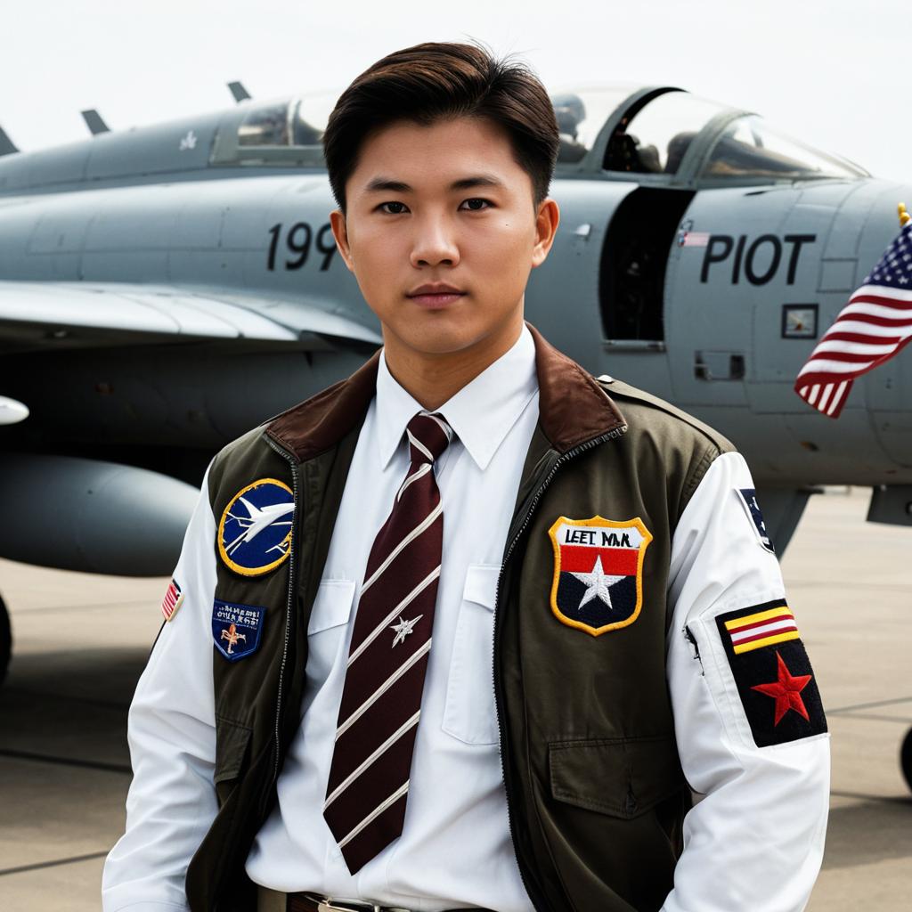 Portrait of an Asian male military pilot standing in front of a fighter jet. He is wearing a white collared shirt with a striped necktie, a green and brown pilot jacket adorned with various patches, including an American flag patch. The gray fighter jet is partially visible in the background, featuring the designation 'PIOT' and an American flag decal.