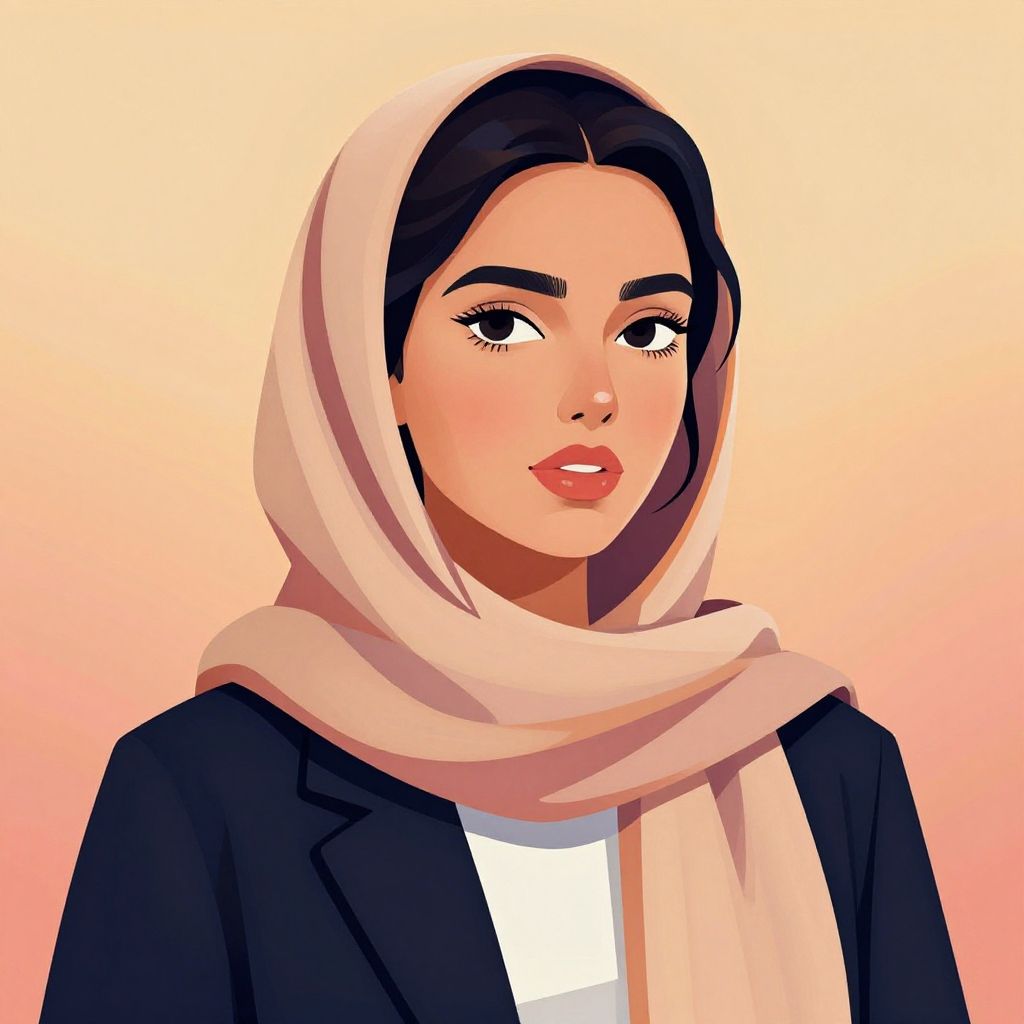 This striking illustration features a young woman wearing an elegant headscarf, set against a warm gradient background. The artwork showcases a modern, stylized aesthetic with vibrant colors and smooth lines, emphasizing the subject's captivating expression and unique attire.