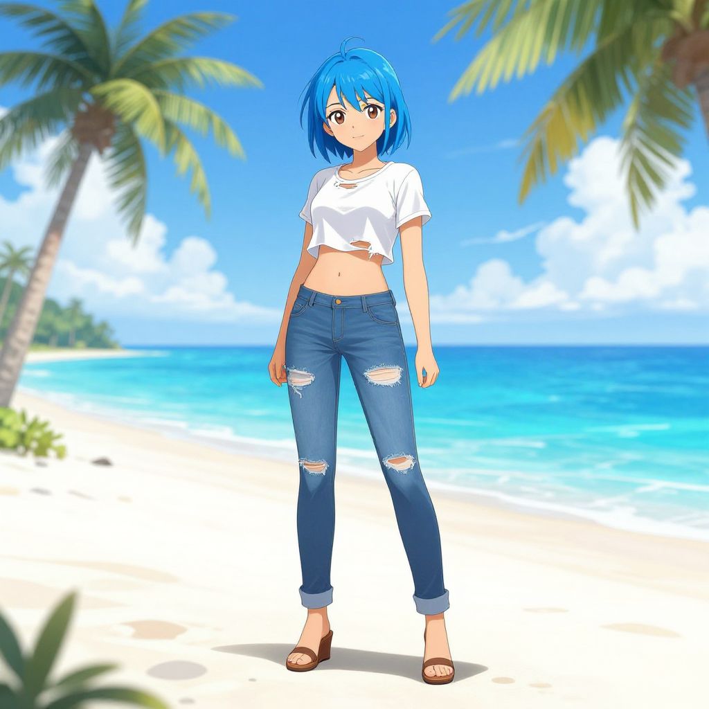 A vibrant digital illustration of a young woman with blue hair and expressive eyes, sporting a blue jacket and matching swimwear. She playfully adjusts her red cap with goggles, set against a sunny outdoor background, capturing a lively and youthful energy in a modern, detailed art style.