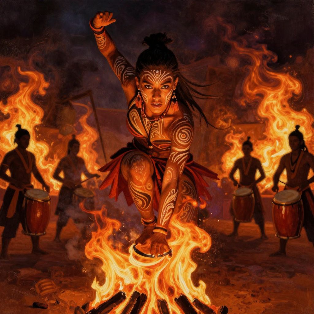 Digital artwork depicting a fierce, tattooed female dancer with dark skin and black hair in a ponytail, crouched over a blazing fire. She wears a red skirt and intricate body tattoos, with one arm raised and the other resting on her knee. Silhouetted drummers with traditional instruments surround her in the background, also engulfed in orange and yellow flames. The dark, smoky backdrop contrasts with the vivid firelight, highlighting the dancer's intense expression and dynamic pose. The scene exudes a sense of primal energy and cultural ritual.