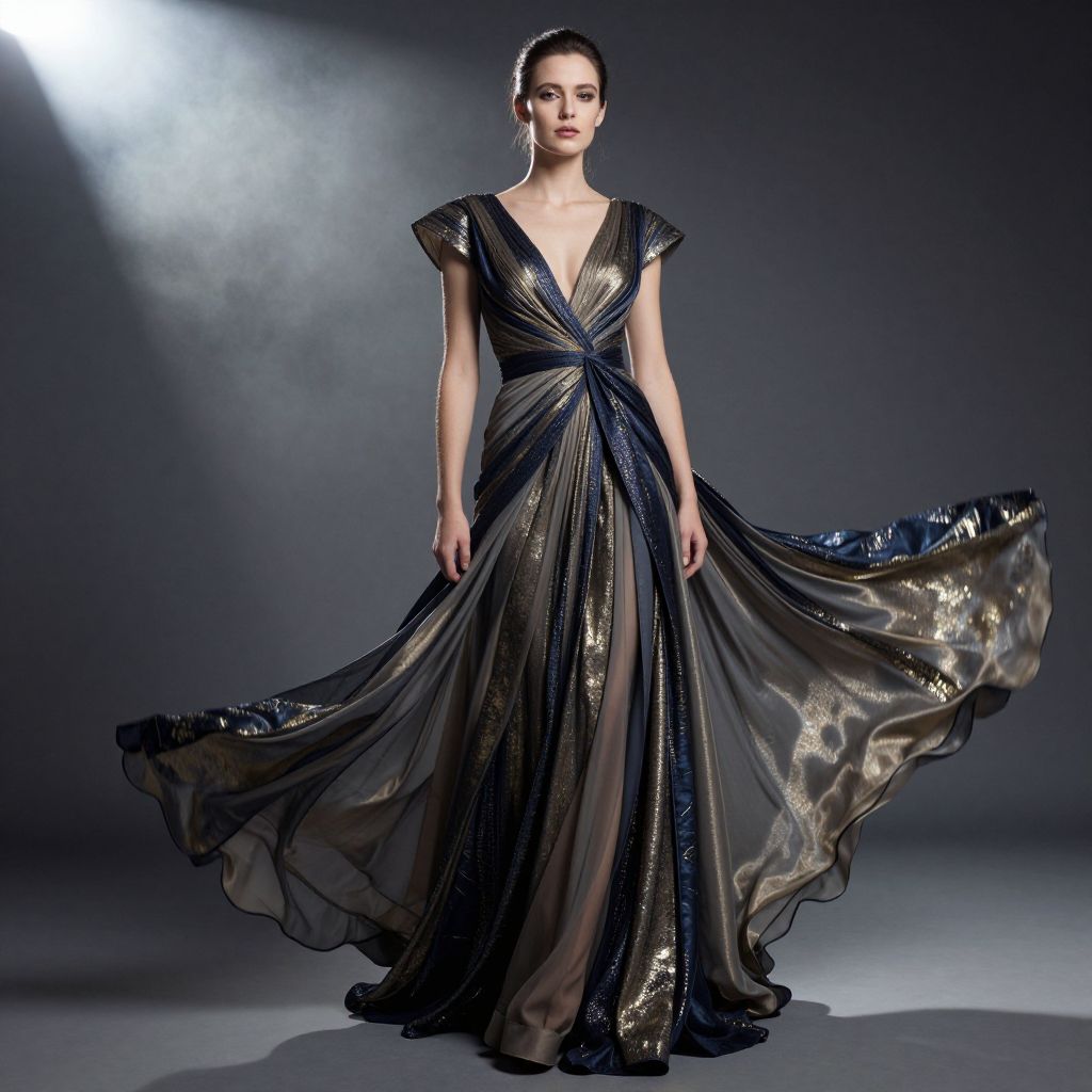 High fashion portrait, model dressed in an elaborate gown with metallic accents and flowing fabrics, studio setting with dramatic spotlight, smoky background, emphasizing movement and texture, sophisticated and artistic mood.