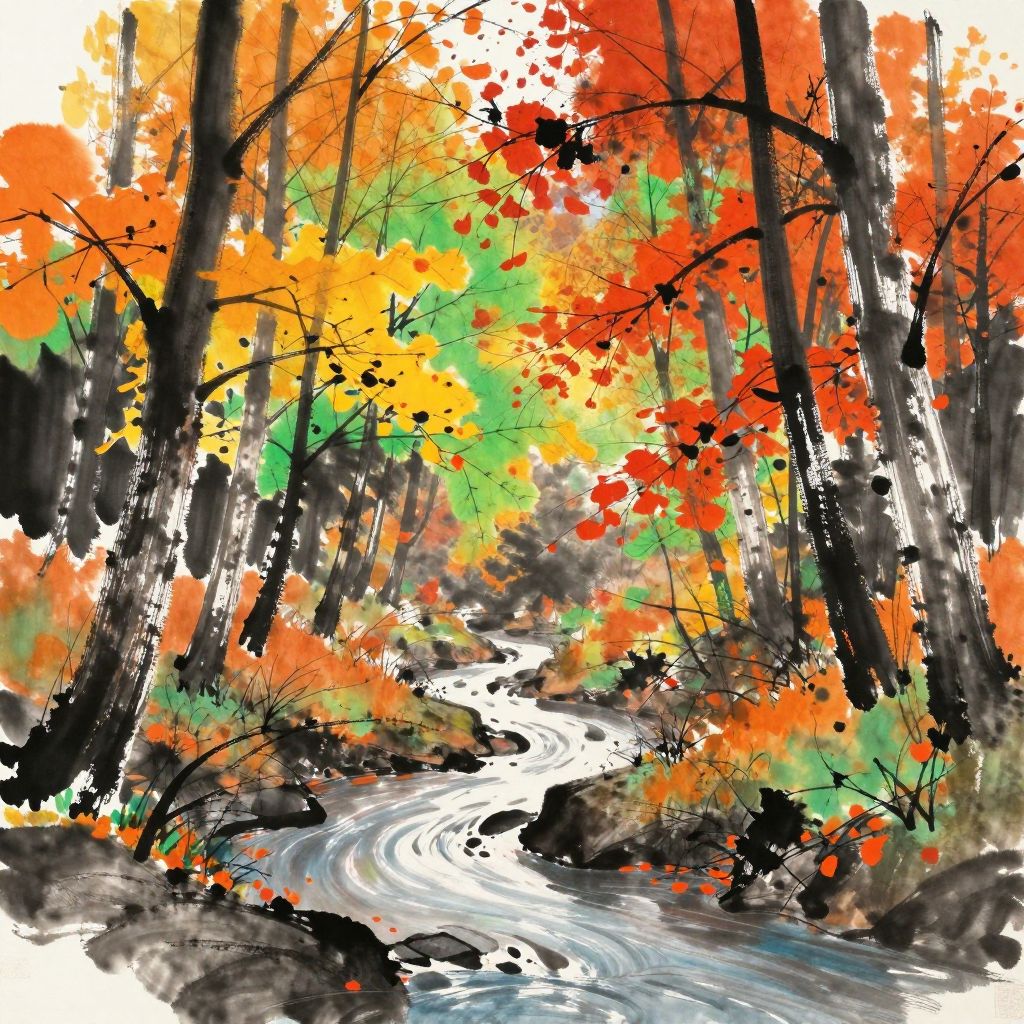 Ink painting of a vibrant autumn forest featuring colorful orange, yellow, green, and red leaves along a small creek with black tree trunks. The artwork showcases the rich hues of fall foliage and the fluid style of ink painting emphasizing the natural beauty of the forest landscape.